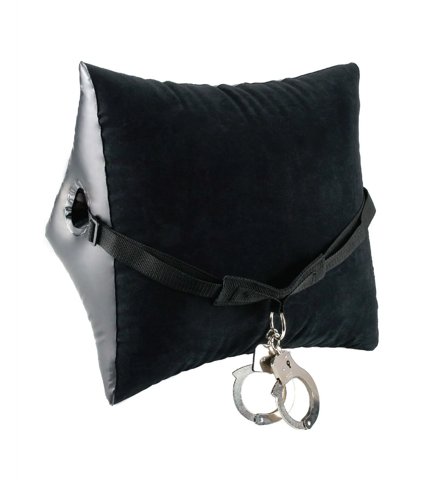 Бархатистое покрытие из винила на подушке будет приятно касаться кожи, исключая любой дискомфорт. Металлические наручники можно открыть даже без ключей. Так как подушка надувная, ее будет удобно хранить в доме или брать с собой в дорогу. Подушка выдержит вес до 136 кг.