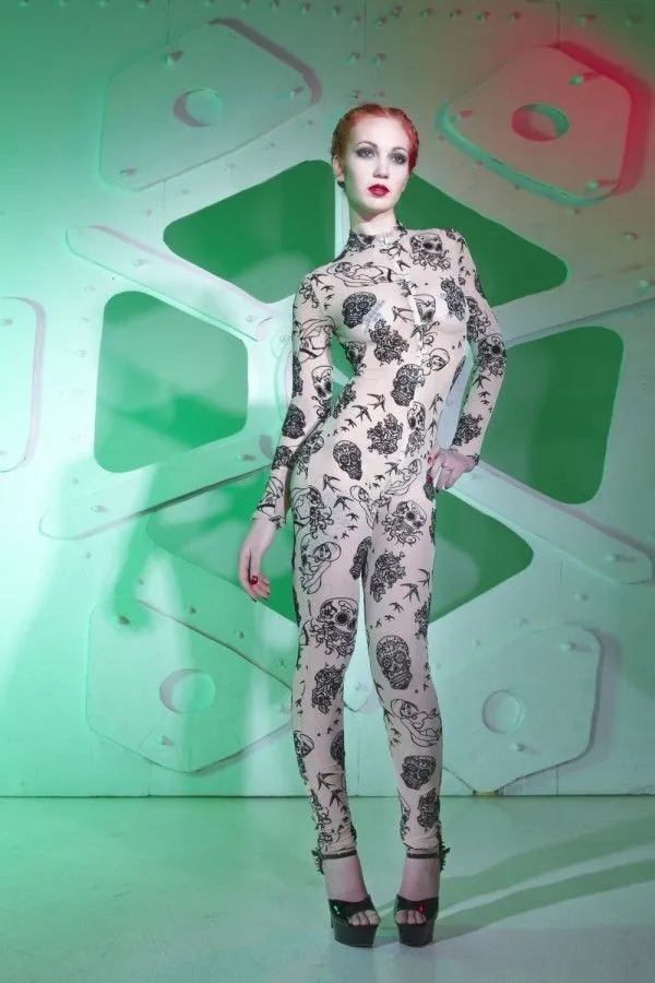 Комбинезон от французского модельера Patrice Catanzaro добавит Вашему образу страстности и сексуальности. Он отлично облегает фигуру, подчеркивая все ее достоинства и плавные изгибы. Комбинезон выполнен из прозрачного материала и декорирован узорами, напоминающими элементы татуировки. На молнии есть несколько ползунков, которые позволят Вам сделать отверстия в нужных местах. Благодаря подобной немного провокационной задумке, Вы сможете сами определять когда и где Ваш избранник сможет насладиться видом Вашего обнаженного тела.