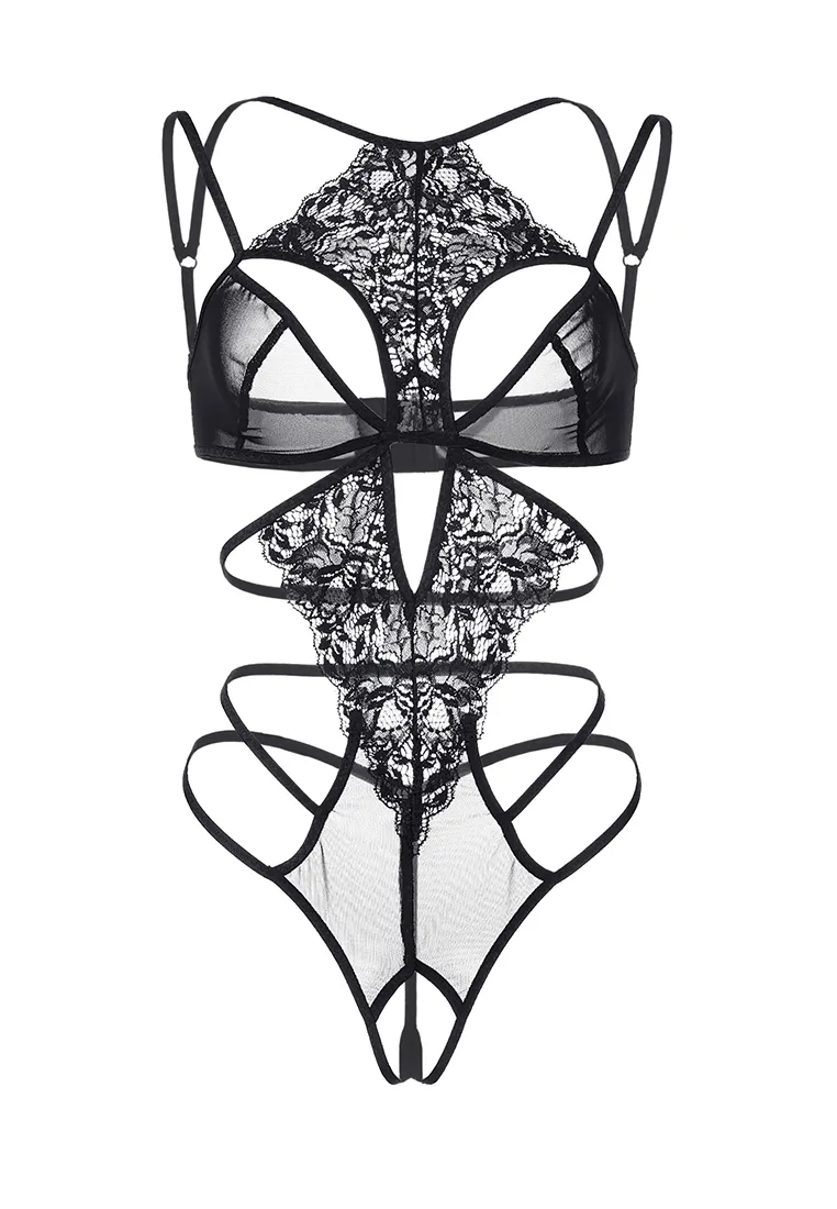 Эротическое боди с кружевным жабо Erolanta® Eva из эластичной сетки со вставками кружева со свободным краем. Фигурные вырезы открывают верхнюю часть груди. Регулируемые бретели и застежка на спине. *Допускается замена кружева на аналогичное.