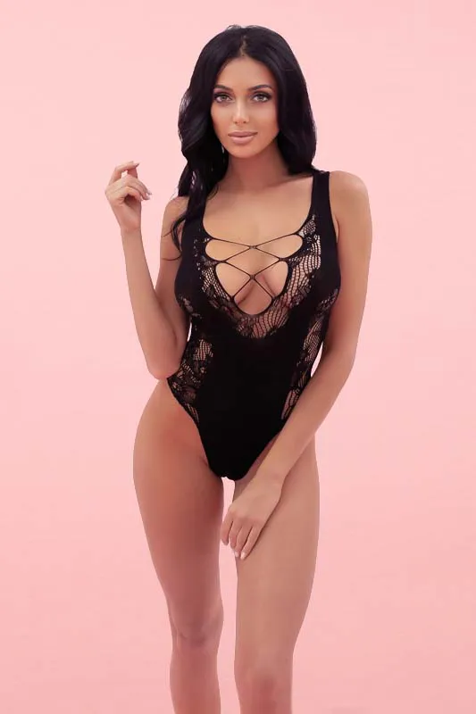Сексуальный боди с V-образным воротником. Дизайн выполнен в виде мелкой сетки, дополненой контрастным ажурными вставками, подчеркивающими изгибы тела.