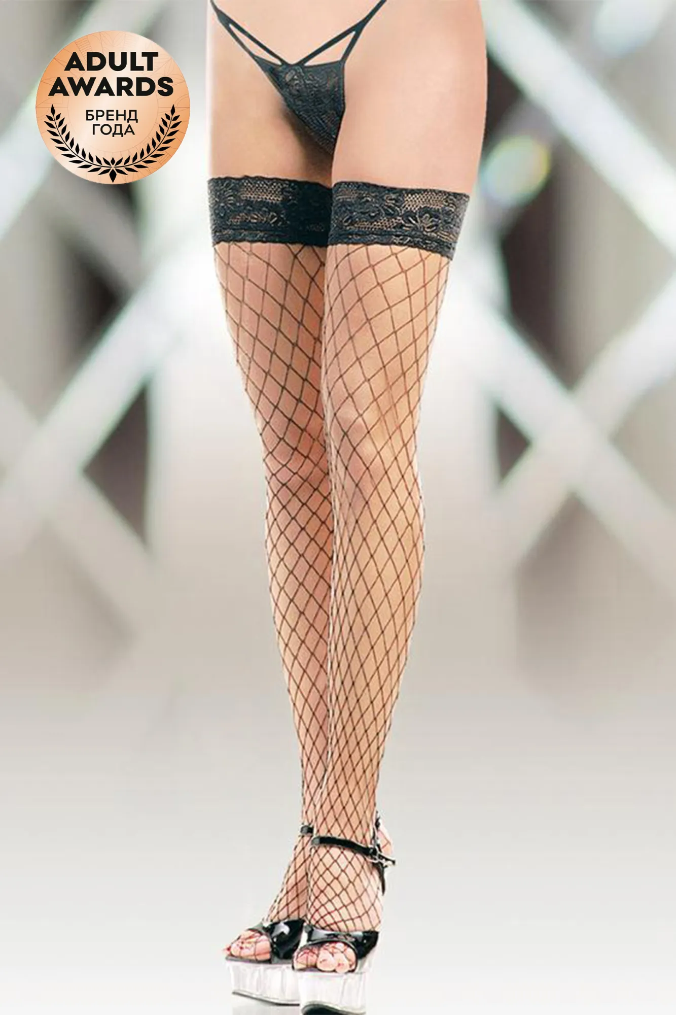 Чулки в крупную сетку на кружевной резинке с силиконовыми полосками.
