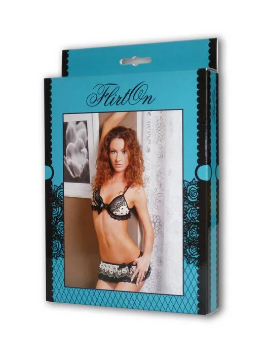 Комплект идеально подойдёт для любительниц белья с лёгким намёком на ретро. Бюстгальтер, юбочка и трусики–стринг декорированы кружевом нежно бежевого оттенка, края которого выразительно обрамлены рисунком ажурных фестонов. Чёрный горошек на кружеве, воланы и бантики придают лёгкую кокетливость образу.