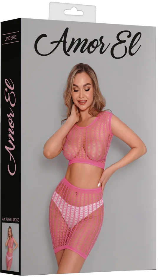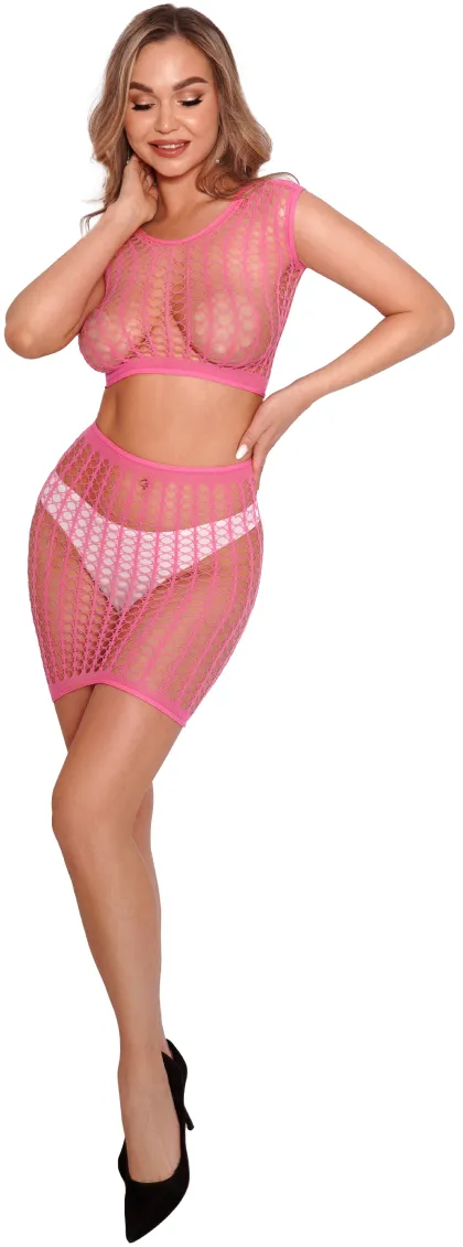 Комплект яркого и соблазнительного сетчатого белья, состоящего из полупрозрачного топа и короткой юбки.