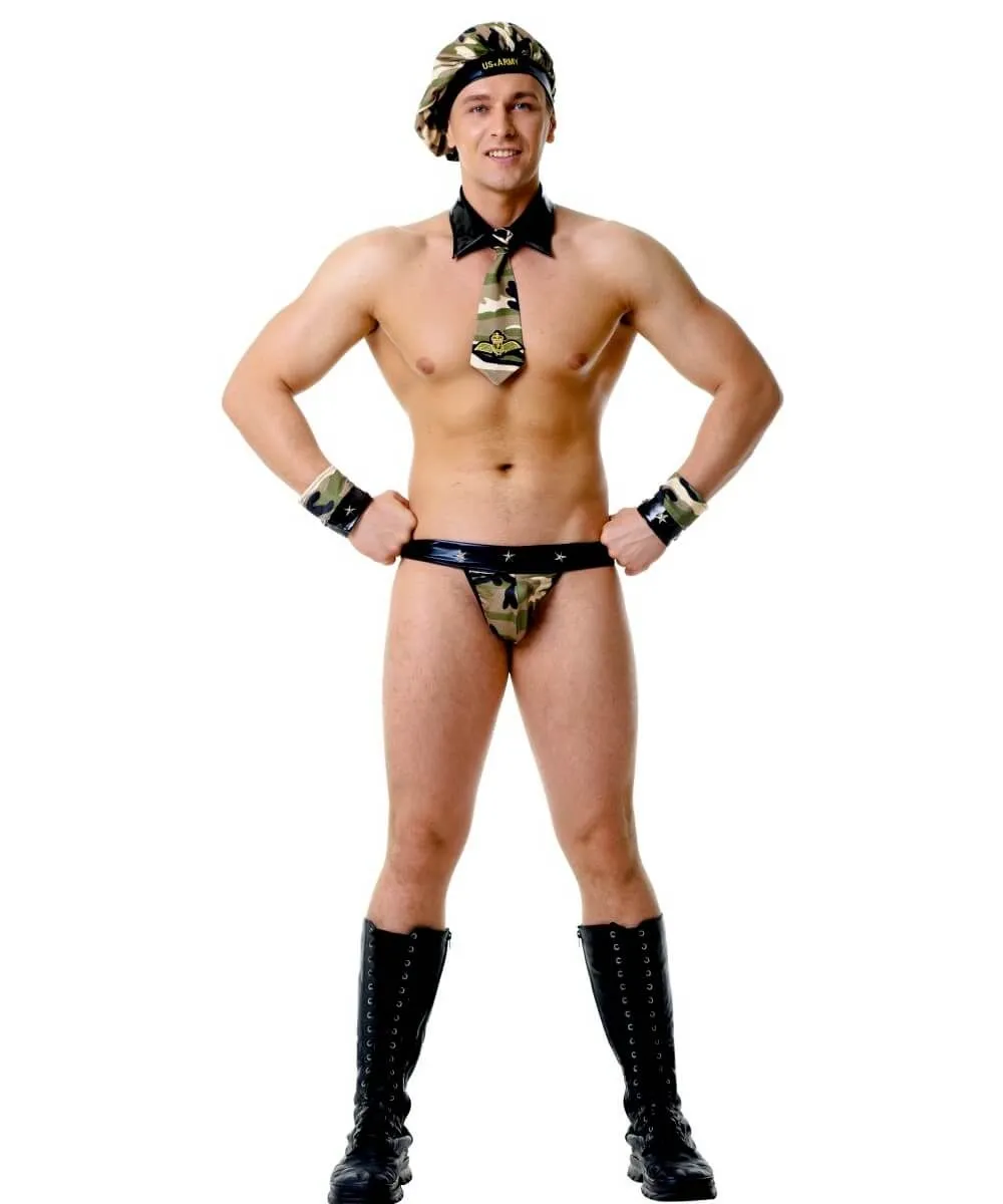 Мужской игровой костюм военного от компании Le Frivole подойдет для оригинальных и смелых мужчин, желающих приятно удивить свою избранницу! Преобразившись в храброго и страстного военного, Вы сможете покорить партнершу своей сексуальностью и неприкрытой мощью. Костюм включает в себя головной убор, накладной воротник с галстуком, манжеты и трусы. Наряд станет прекрасным вариантом для откровенной костюмированной вечеринки или интимных игр с партнершей.