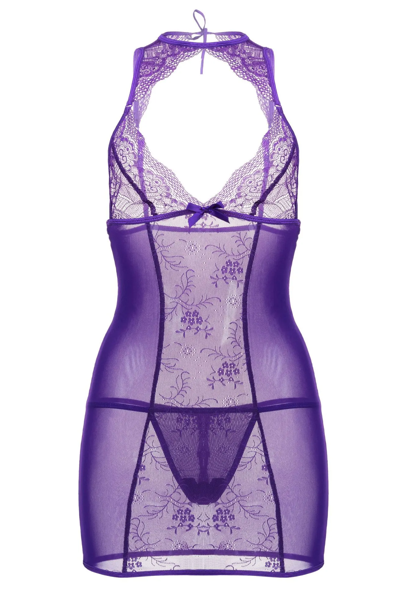 Все внимание на грудь! Кружевное фигурное декольте комбинации Candy Girl® Scarlett притягивает к себе все взгляды. Сатиновый бантик на уровне груди придает кокетства образу. Изящная кружевная спинка, регулируемые бретели и завязка на шее обеспечивают идеальную посадку лифа. Облегающий крой подчеркивает манящие изгибы силуэта. Вертикальные швы и комбинирование кружевных и сетчатых вставок визуально добавляют фигуре стройности. Эластичные ткани обеспечивают комфортное ношение. Т-стринги идеально завершают образ.