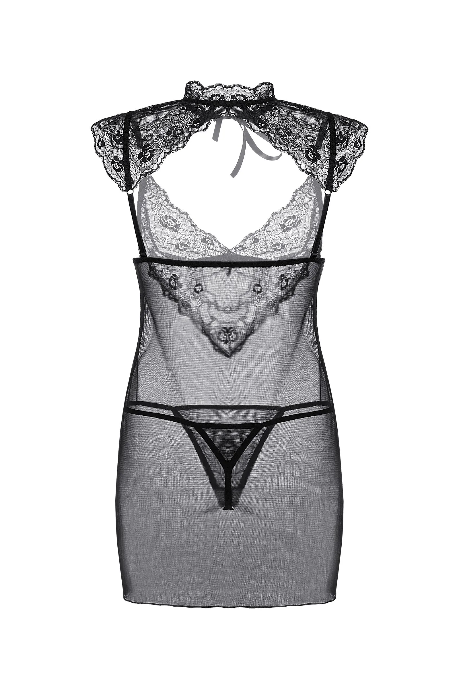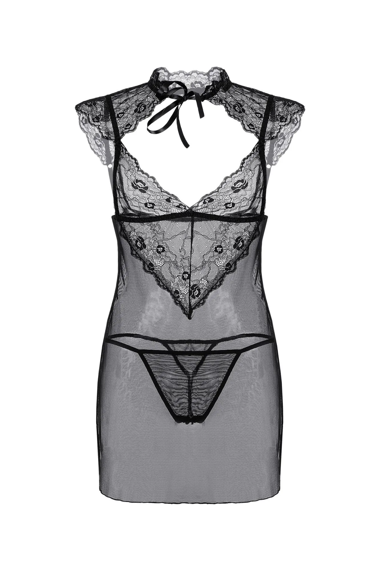 Прозрачная комбинация Luscious от Сandy Girl® облегающего силуэта. Кружевной лиф с воротником-стойкой и мини-рукавами изящно обрамляет глубокое декольте и украшает спинку. Регулируемые бретели сзади обеспечивают идеальную посадку. Стринги из эластичной сетки входят в комплект.