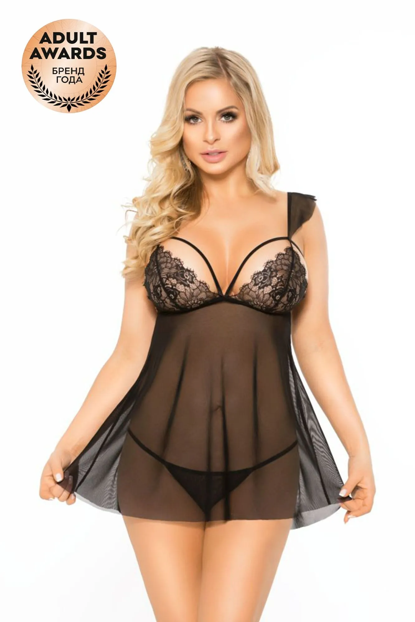 Сексуальная ночная сорочка, выполнена из мягкой сетки и нежного кружева. Лиф сорочки выполнен из кружева с цветочным орнаментом, а тонкие резиночки подчеркивают Вашу грудь. Стринги в комплекте.