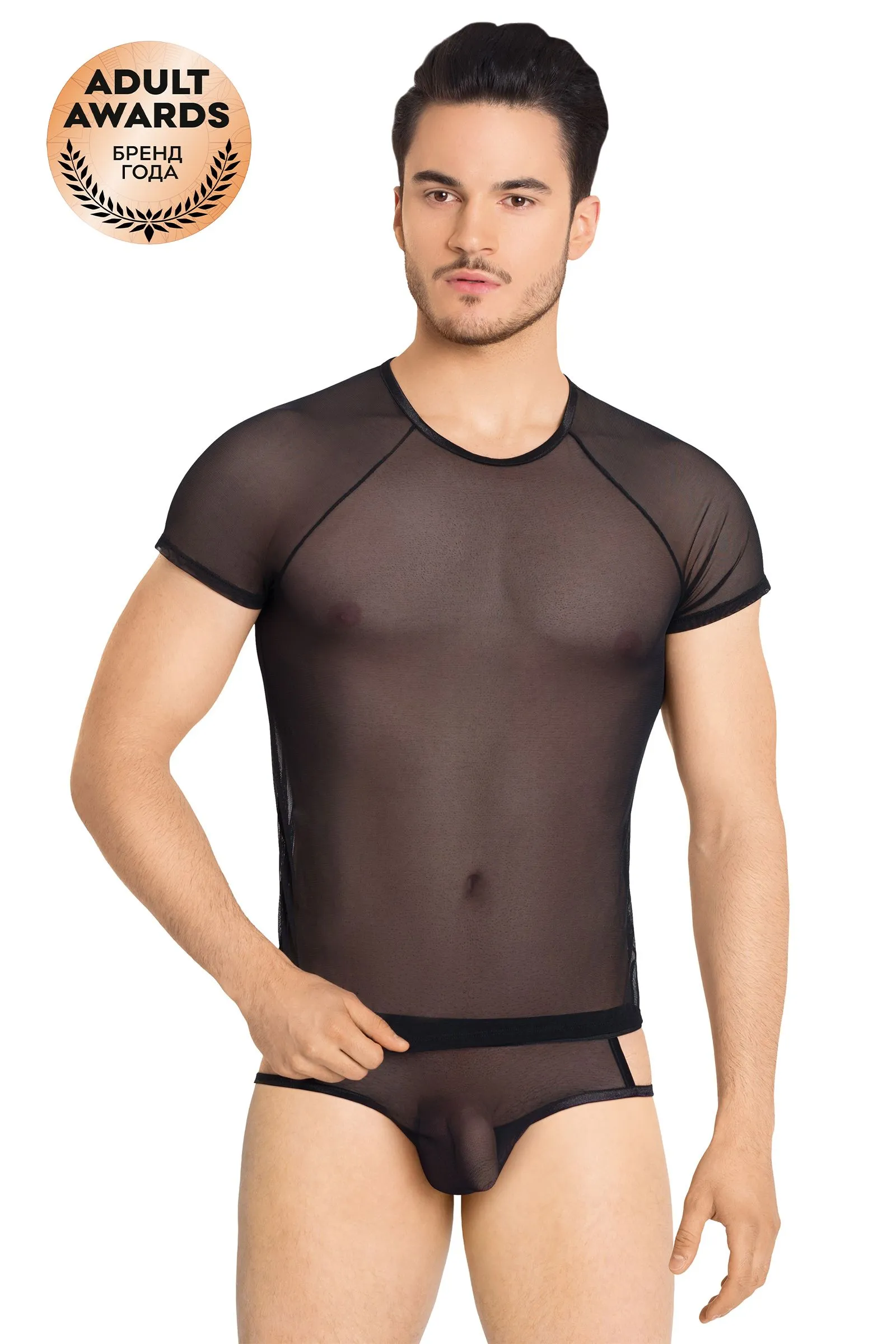 Экстравагантный комплект для смелых мужчин. Футболка и шорты выполнены из крупной эластичной сетки. Задняя часть трусов выполнена из мягкой мелкой сеточки, спереди вставка из такой же сеточки.