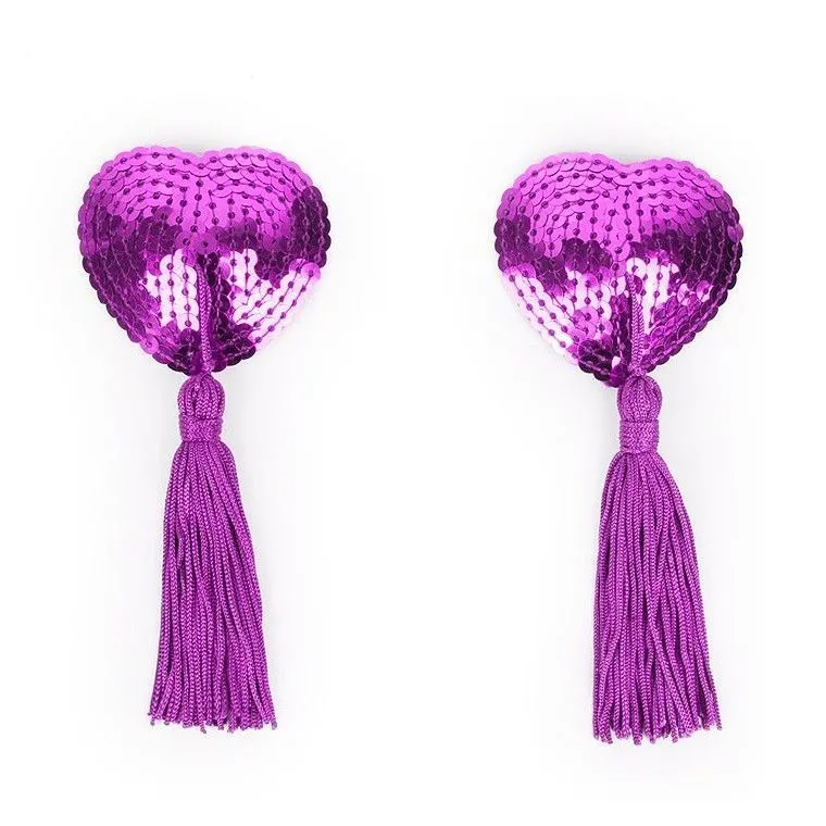 Фиолетовый блестящие пестисы на грудь в форме сердечек с пайетками и кисточкой. Добавят изюминку в любовную игру, украсят соски, сделав грудь привлекательной и манящей. Внешняя сторона изделий отделана пайетками. На внутренней имеется специальный силиконовый слой, за счёт которого аксессуары держаться на сосках.