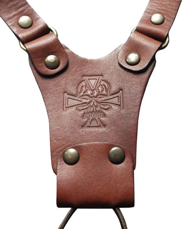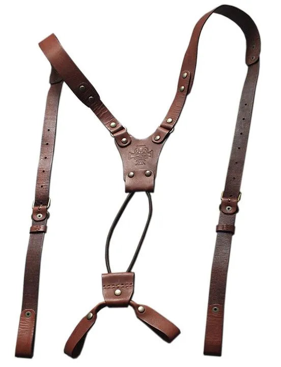 Подтяжки производства российской компании "Подиум" сделаны из натуральной кожи коричневого цвета и декорированы клише с изображением черепа. Такой аксессуар, помимо выполнения своей функциональной роли, поможет Вам в создании нужного образа. Подтяжки визуально сделают силуэт более подтянутым и добавят брутальности.