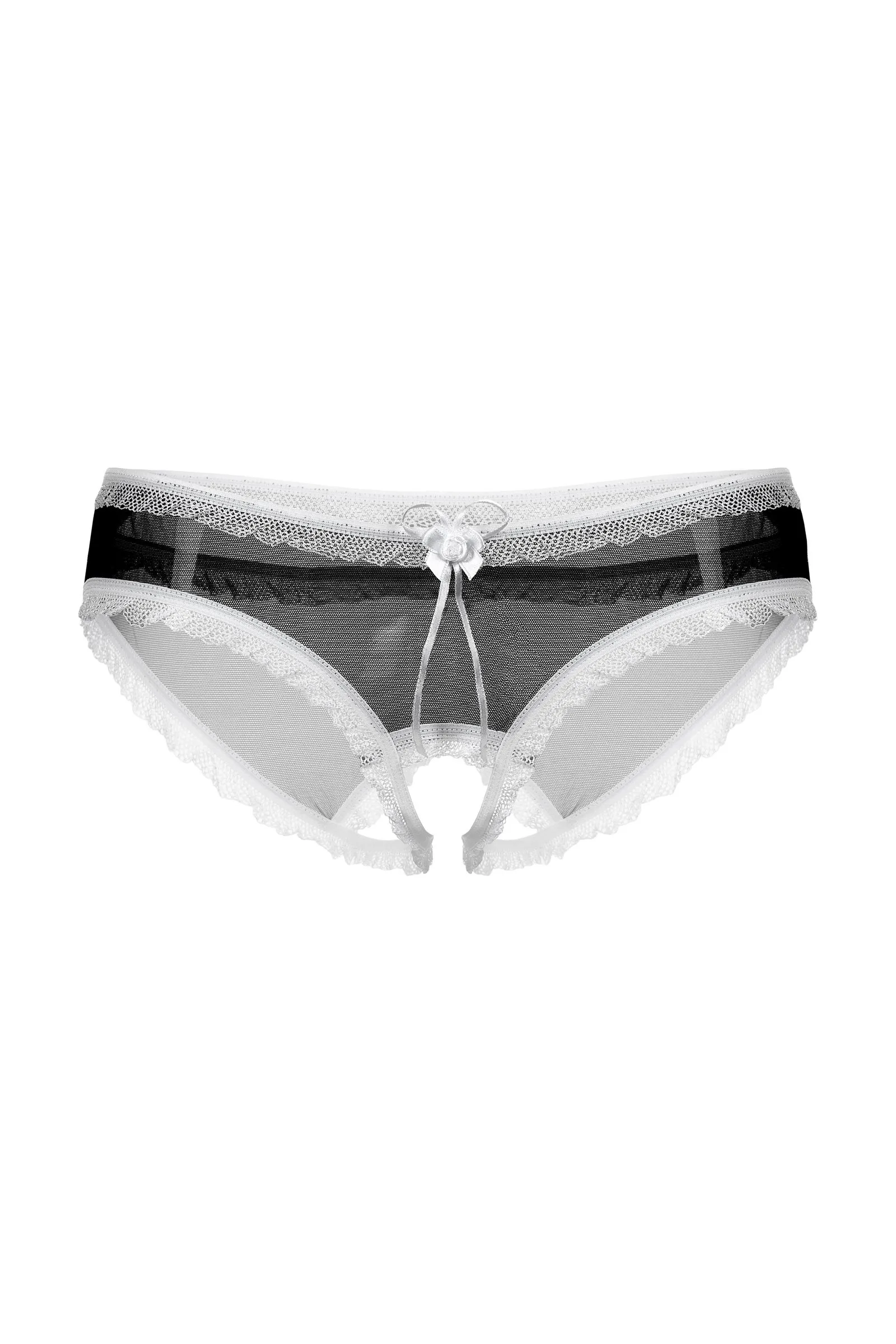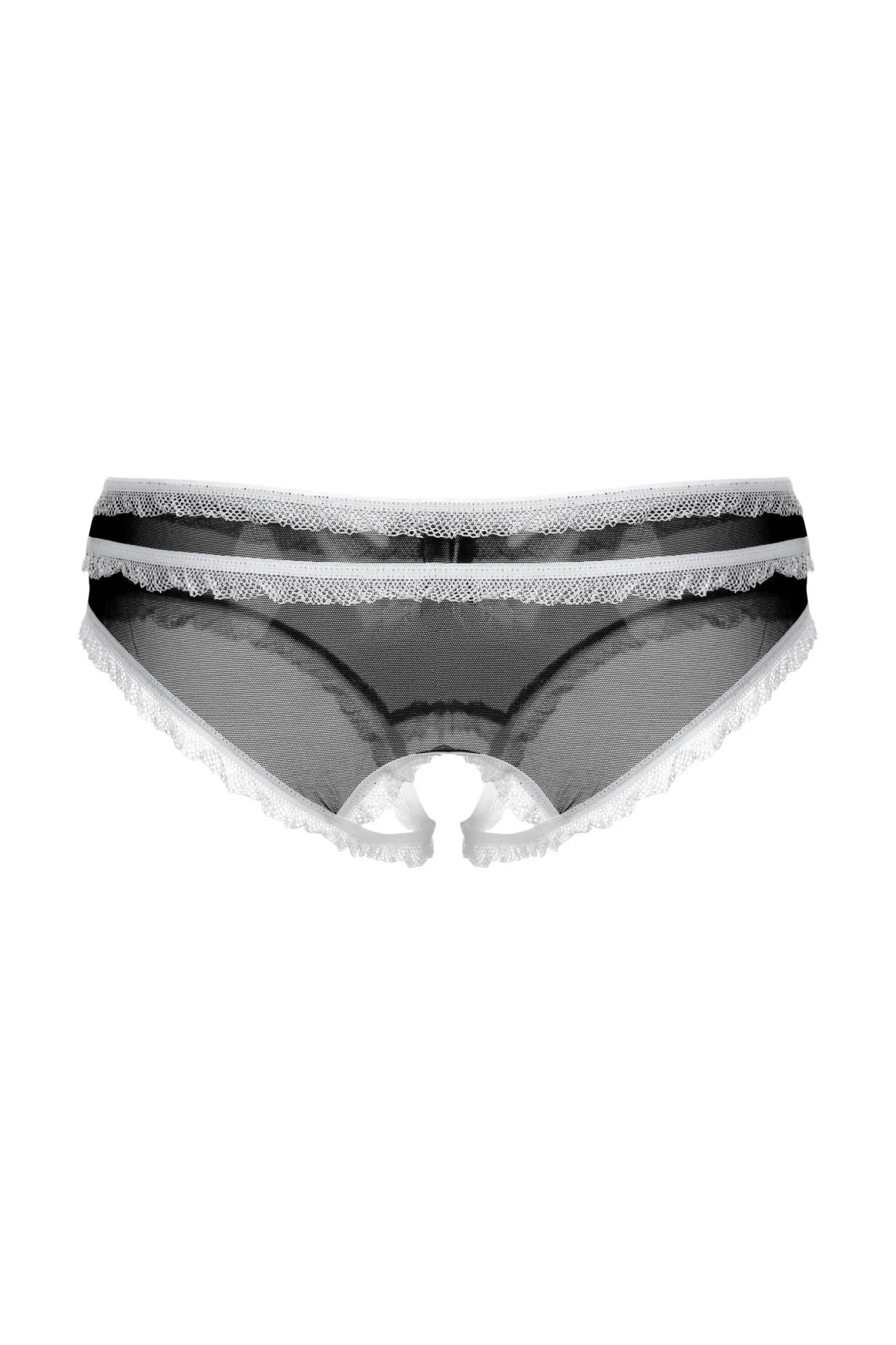 Трусики с открытым доступом. Нежная тонкая черная сеточка в сочетании с белой рюшей и бантиком создают завершенный соблазнительный образ.