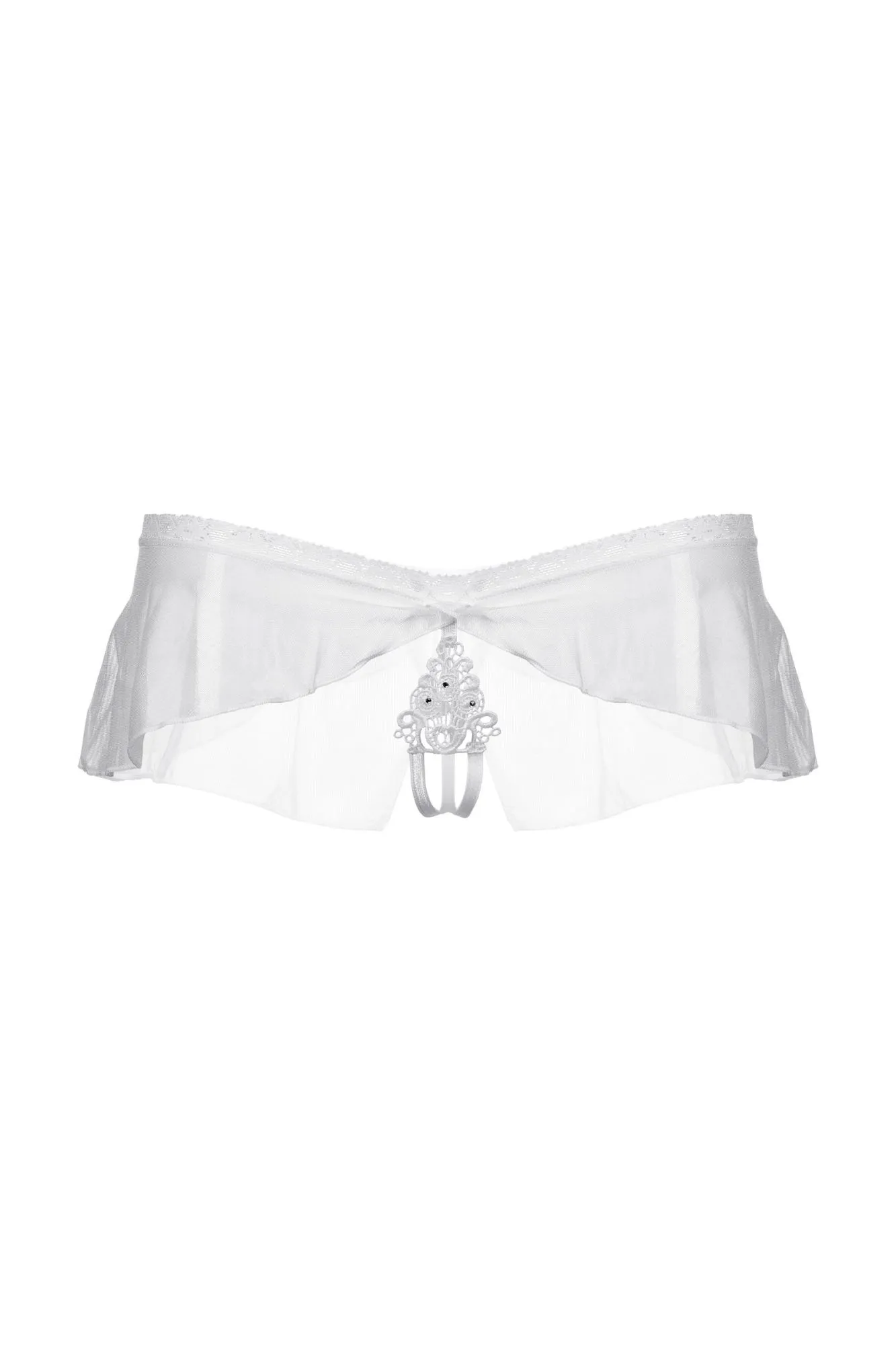 Оригинальные трусики с открытым доступом. Нежное кружево, необычный углубленный верхний край, легкий струящийся тюль и кокетливый бантик сзади создают обольстительный образ.