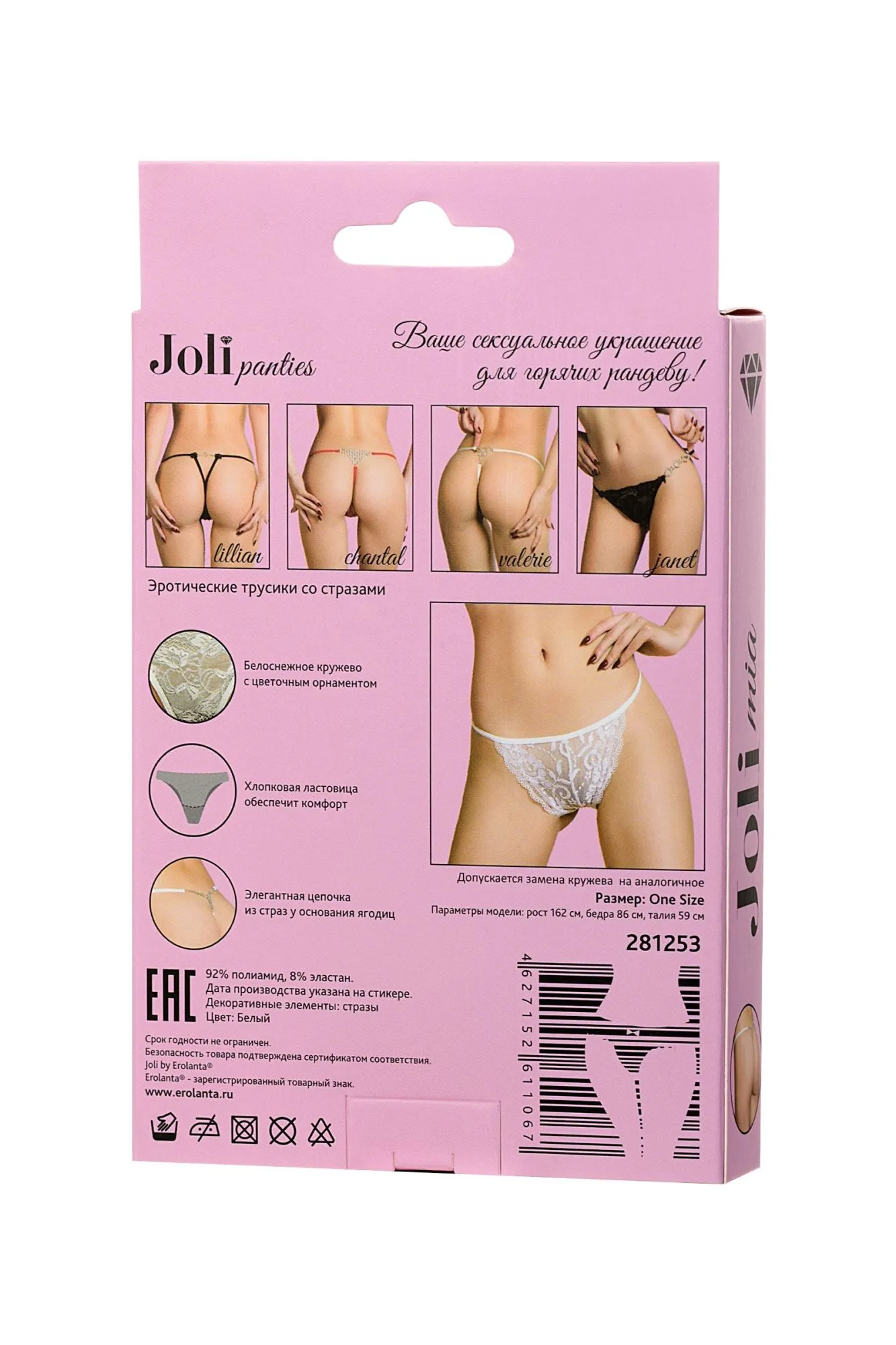 Joli panties – ваше сексуальное украшение для горячих рандеву! Новая линейка романтичного белья Joli (в пер. с французского красивая) радует глаз элегантными деталями и нежными материалами европейского качества. Элегантные и невесомые цветочные кружева спереди. Хлопковая ластовица и мягкие лямки - комфортная нотка вашей сексуальности. Цепочки из страз сзади создают акцент на ваших ягодицах. Joli panties – выбери украшение для обольщения!