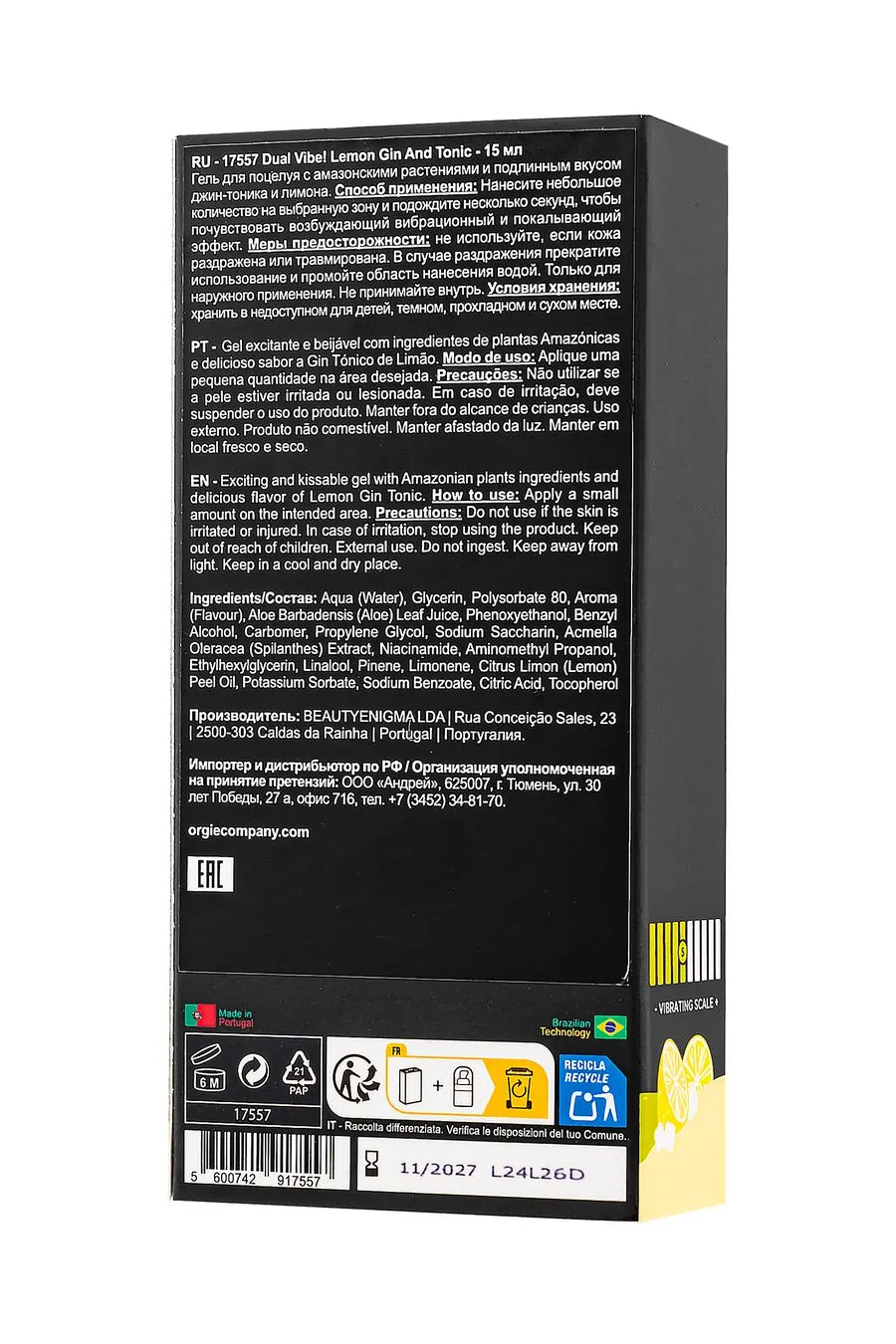Погрузитесь в мир тропического наслаждения с Dual Vibe! Lemon Gin And Tonic от Orgie — жидким вибратором для поцелуев, который привносит нотку изысканности в ваши интимные моменты.