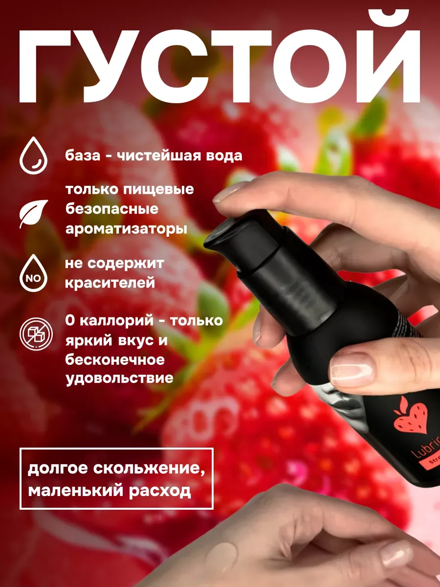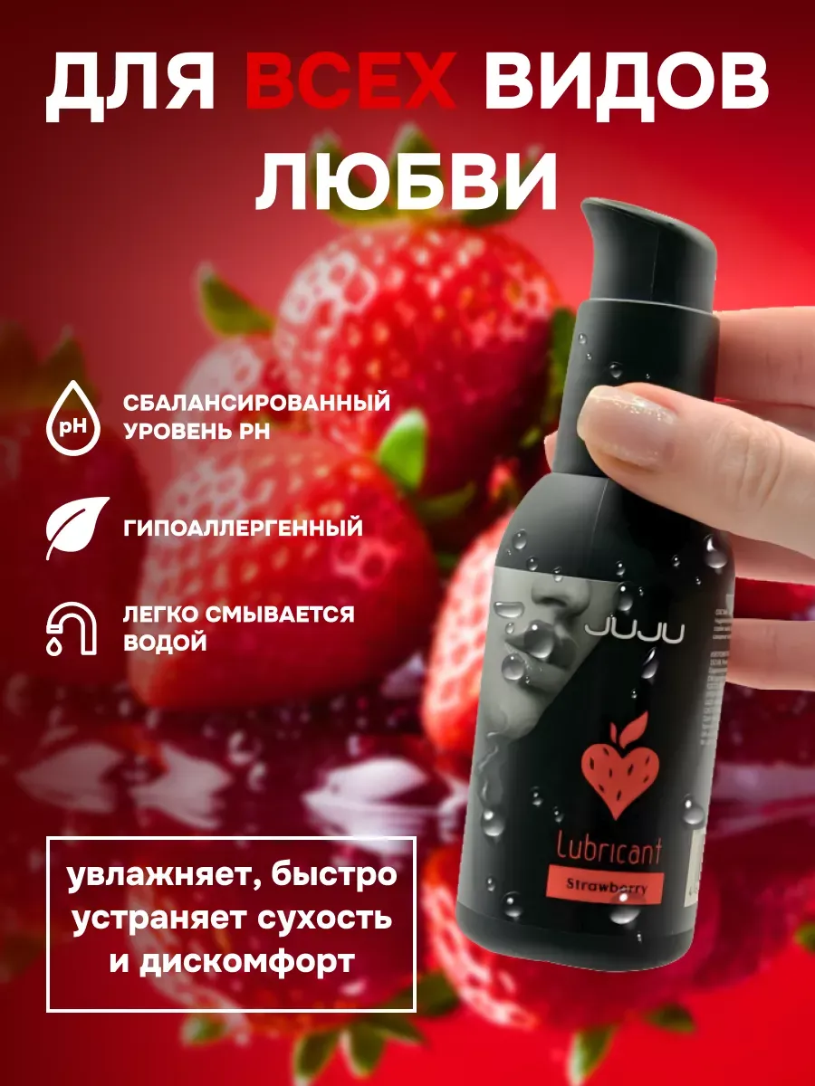 Съедобный лубрикант со вкусом клубники отлично подойдет для любого вида близости. Водная основа смазки позволяет разнообразить интимную жизнь, обеспечивая продолжительное шелковистое скольжение. Лубрикант можно использовать с любыми интим игрушками, а также с презервативами. Состав: вода очищенная, глицерин, гидроксиэтилцеллюлоза, бензоат натрия, сорбат калия, пропиленгликоль, ароматизатор пищевой, сахаринат натрия, лимонная кислота, объем – 100 мл, производитель – JuJu (Россия).  срок годности-3 года.