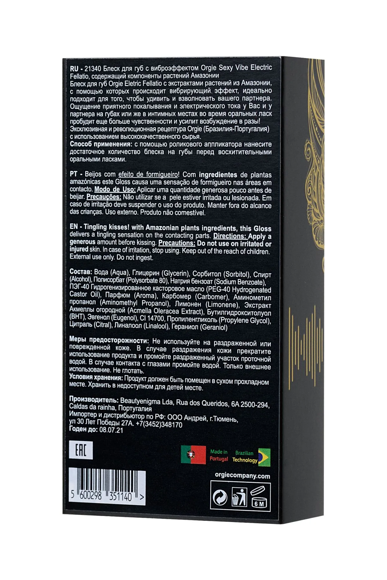 Могут ли поцелуи вызывать электрическую искру и страсть, подобную бразильской? Да, если их дополняет блеск для губ с вибрирующим эффектом Orgie Sexy Vibe Electric Fellatio. Особенность блеска — состав из выжимки редких растений лесов Бразилии, благодаря которому на губах создается покалывающий и одновременно вибрирующий эффект. Это приятное ощущение легко передается партнеру при поцелуях, делая их возбуждающе притягательными и запоминающимися. Блеск отлично увлажняет и питает кожу губ благодаря экстракту акмеллы в составе — цветку, который так любят жительницы жаркой Бразилии. При ежедневном использовании заметен лифтинг-эффект. Блеск содержит только безопасные и качественные компоненты, не вызывающие раздражение даже на слизистой. А это значит, что ваши поцелуи могут быть максимально интимными. Подарите своим чувствам Orgie.