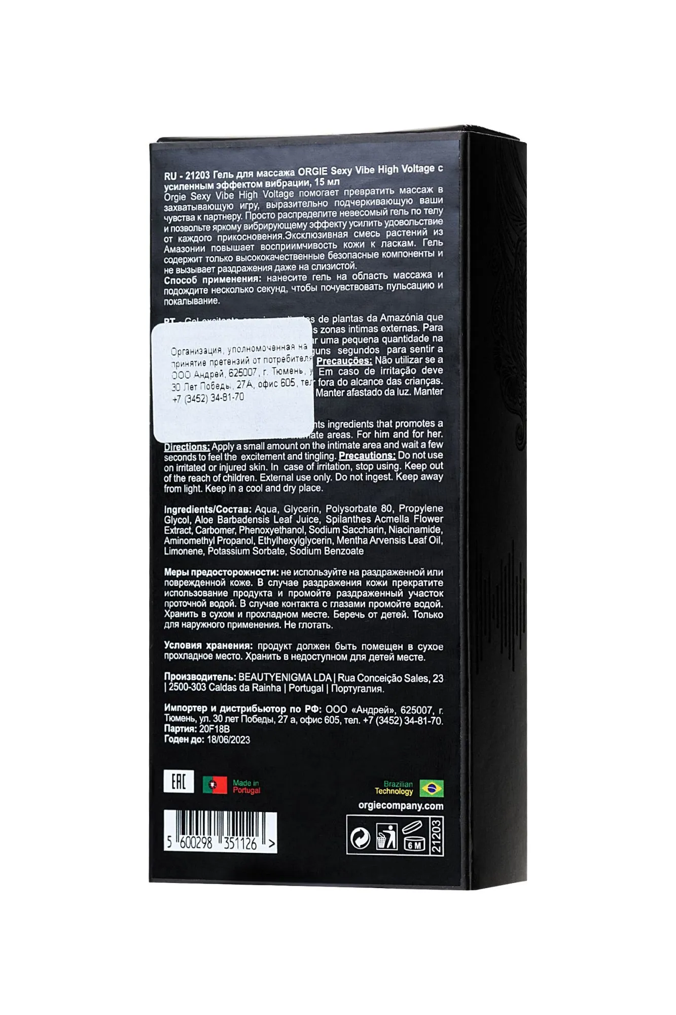Orgie Sexy Vibe High Voltage помогает превратить массаж в захватывающую игру, выразительно подчеркивающую ваши чувства к партнеру. Просто распределите невесомый гель по телу и позвольте яркому вибрирующему эффекту усилить удовольствие от каждого прикосновения. Эксклюзивная смесь растений из Амазонии повышает восприимчивость кожи к ласкам. Гель содержит только высококачественные безопасные компоненты и не вызывает раздражения даже на слизистой. Способ применения: нанесите гель на область массажа и подождите несколько секунд, чтобы почувствовать пульсацию и покалывание.