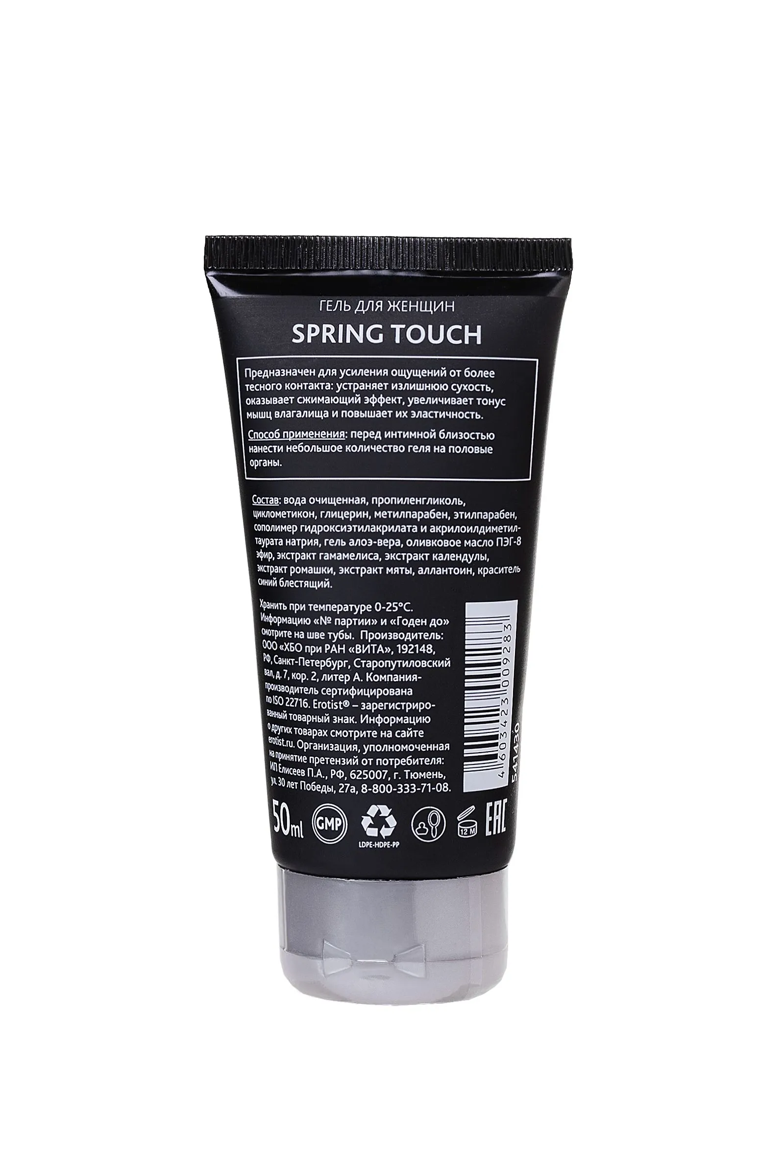 Как почувствовать весеннее прикосновение в любое время года? С помощью геля для женщин Erotist Spring Touch на водной основе. Этот гель создан, чтобы каждый день близость с партнёром радовала нежностью, похожей на поцелуй весны. Натуральные компоненты деликатно подчёркивают естественный аромат тела. Концентрация геля дарит шелковистое скольжение. Но самое главное — Erotist Spring Touch обладает сжимающим эффектом, который увеличивает тонус мышц влагалища. Тесный контакт, усиливающий степень эйфории, гарантирован!