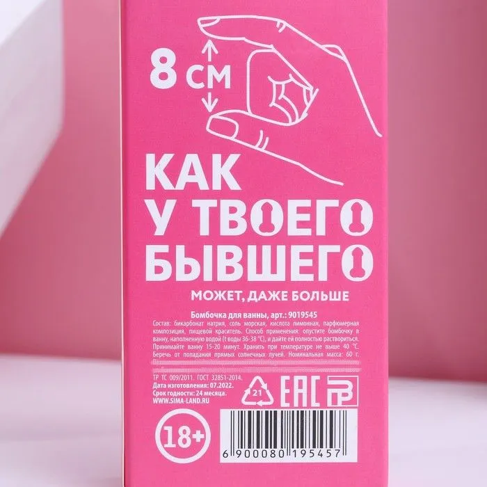 Бурлящая бомбочка "Бывший позавидует" в виде члена разнообразит прием ванны. Сувенир в виде мужского достоинства 8 см в длину и весом 60 г взбудоражит фантазию, а сладкий аромат подарит приятные ощущения.