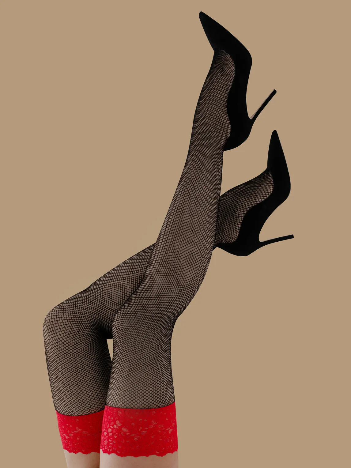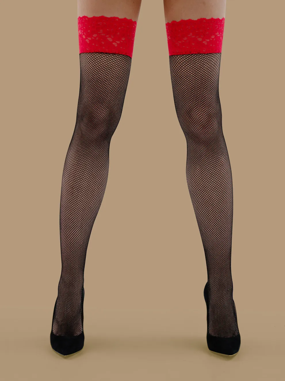 Чулки черные в мелкую сетку с красным кружевом и силиконом