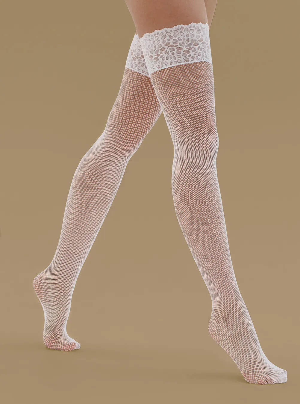 Чулки белые в мелкую сетку с белым кружевом и силиконом