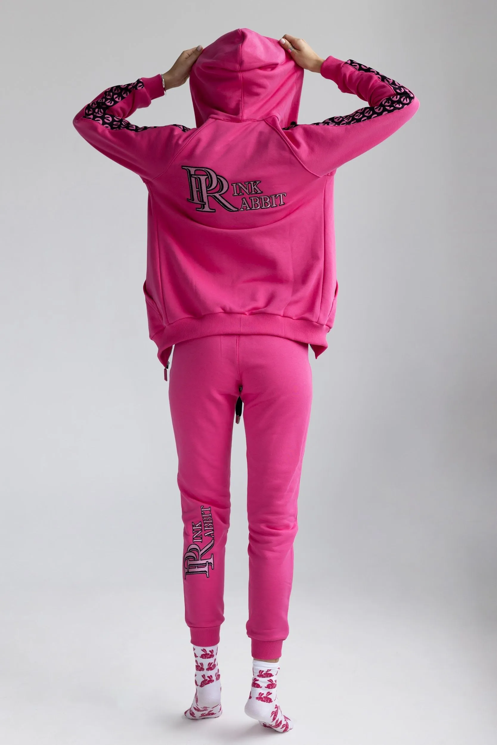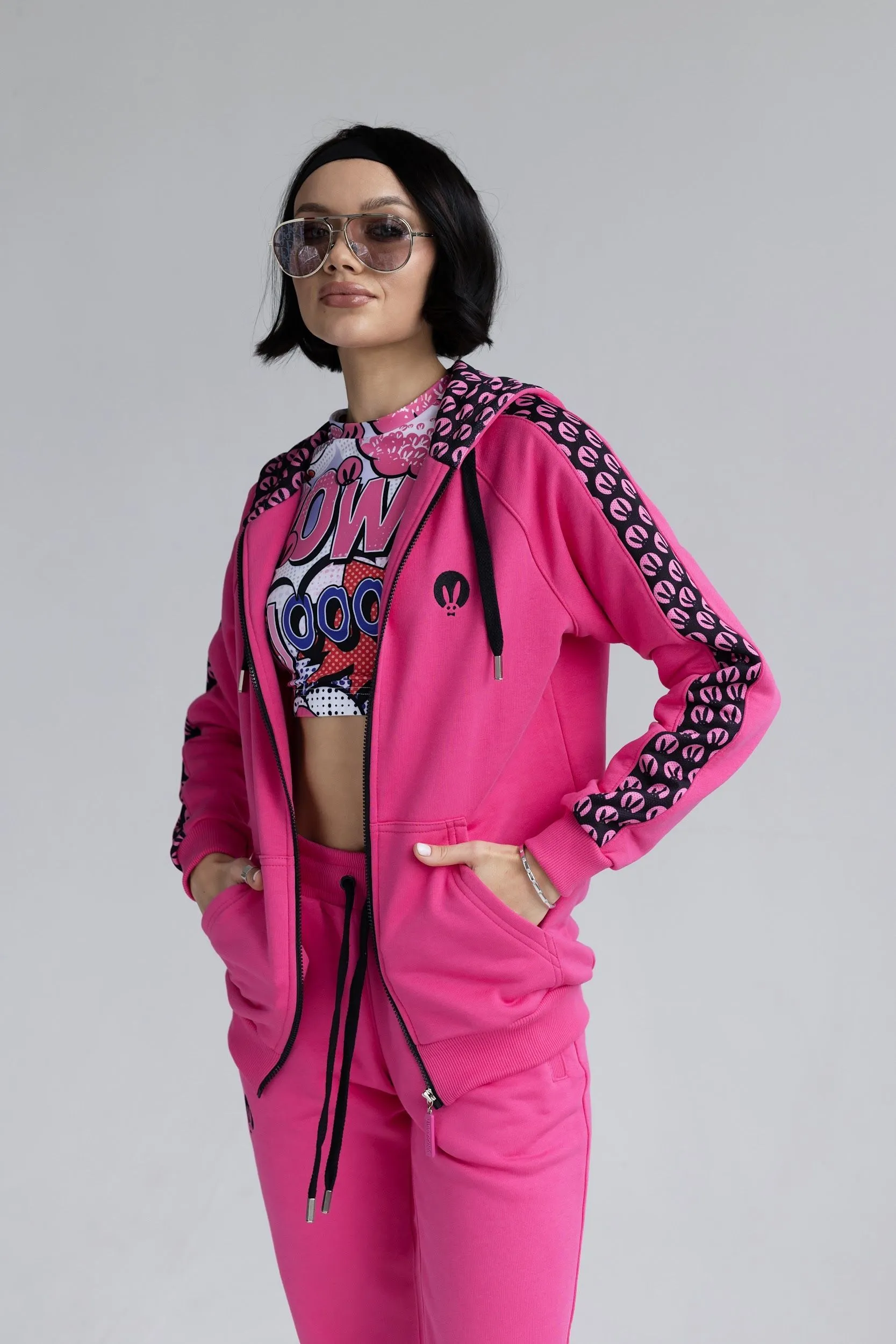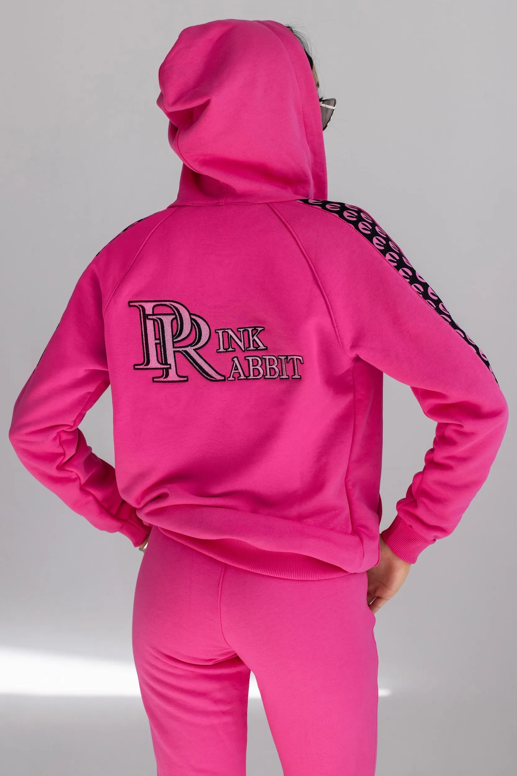 Розовый спортивный женский костюм от Pink Rabbit выполнен из хлопкового футора. Костюм состоит из бомбера и брюк. Подходит как для пробежки в парке, так и для расслабленного отдыха. А если добавить аксессуары и туфли на каблуке, то можно смело отправляться в нём на вечеринку.