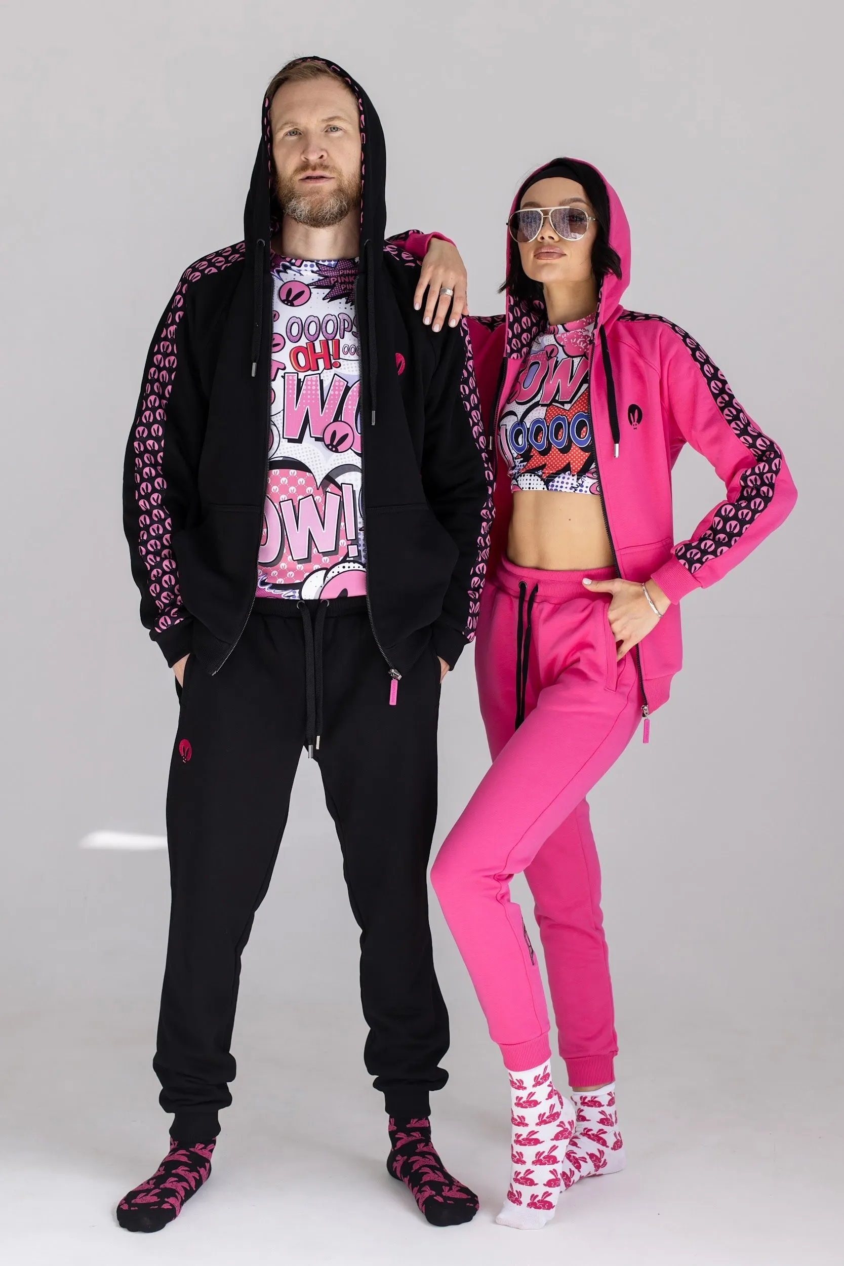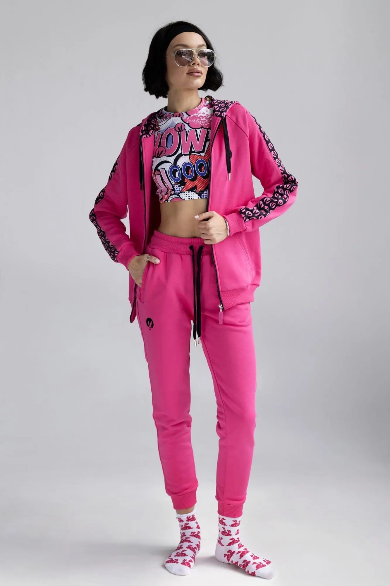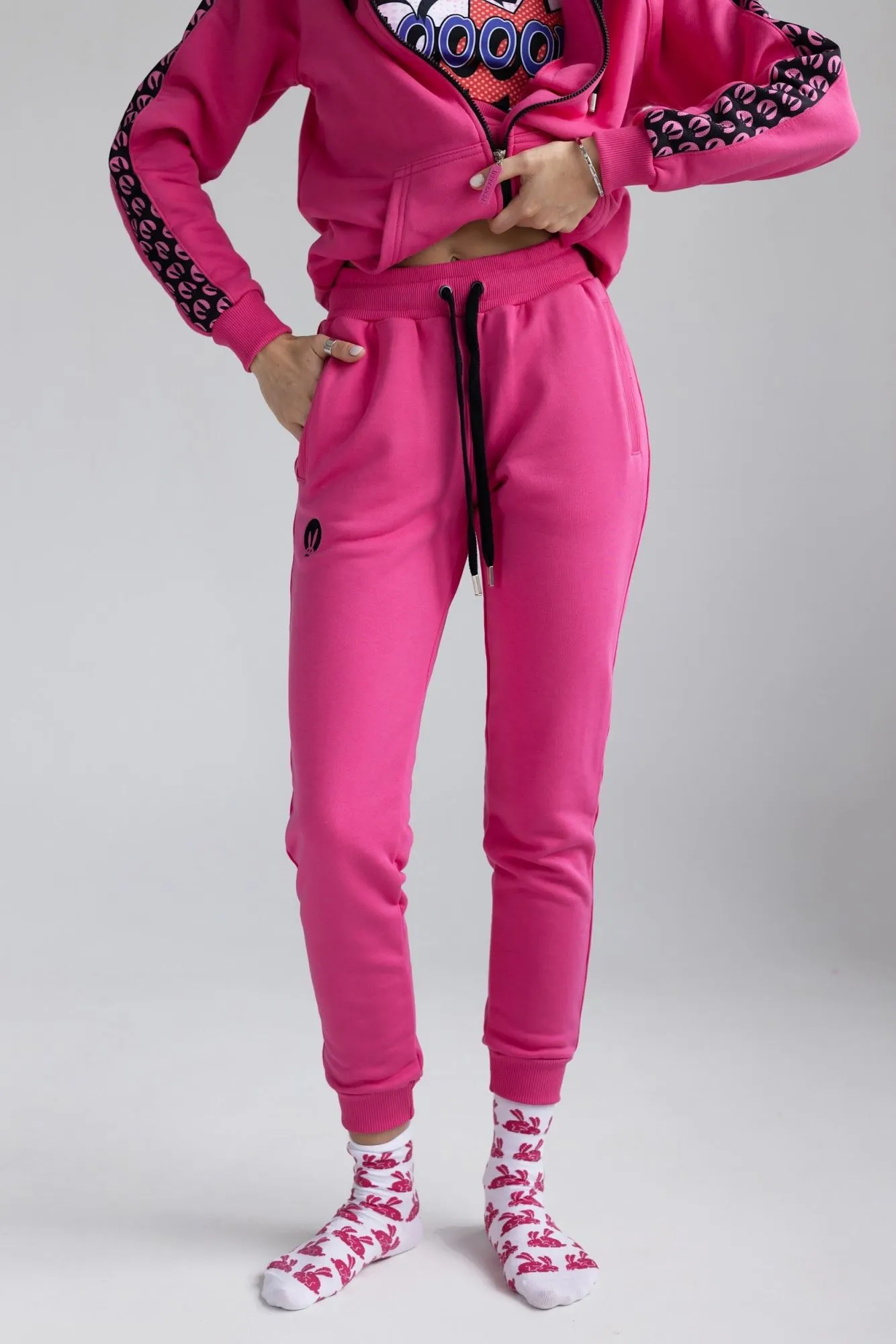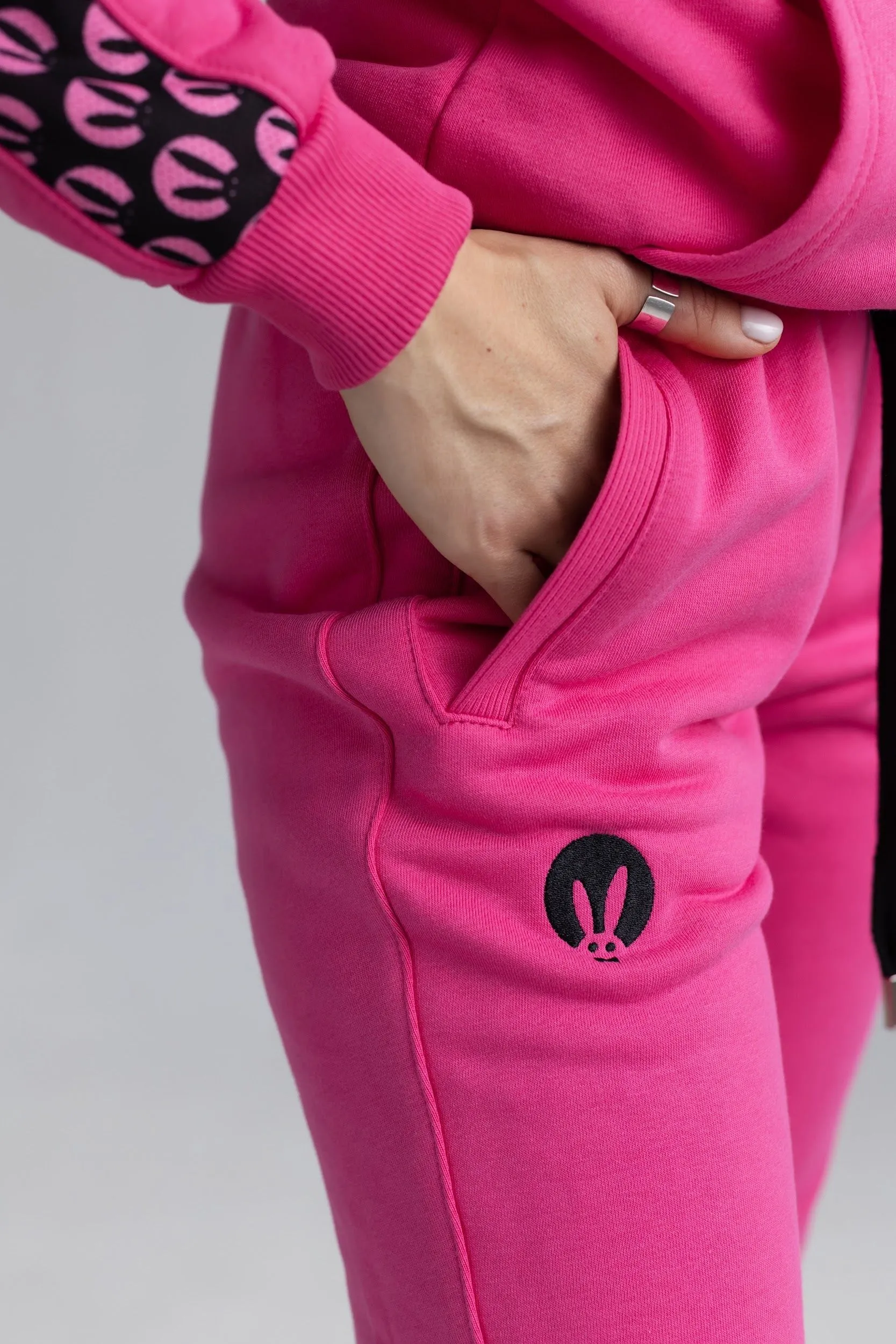 Розовый спортивный женский костюм от Pink Rabbit выполнен из хлопкового футора. Костюм состоит из бомбера и брюк. Подходит как для пробежки в парке, так и для расслабленного отдыха. А если добавить аксессуары и туфли на каблуке, то можно смело отправляться в нём на вечеринку.