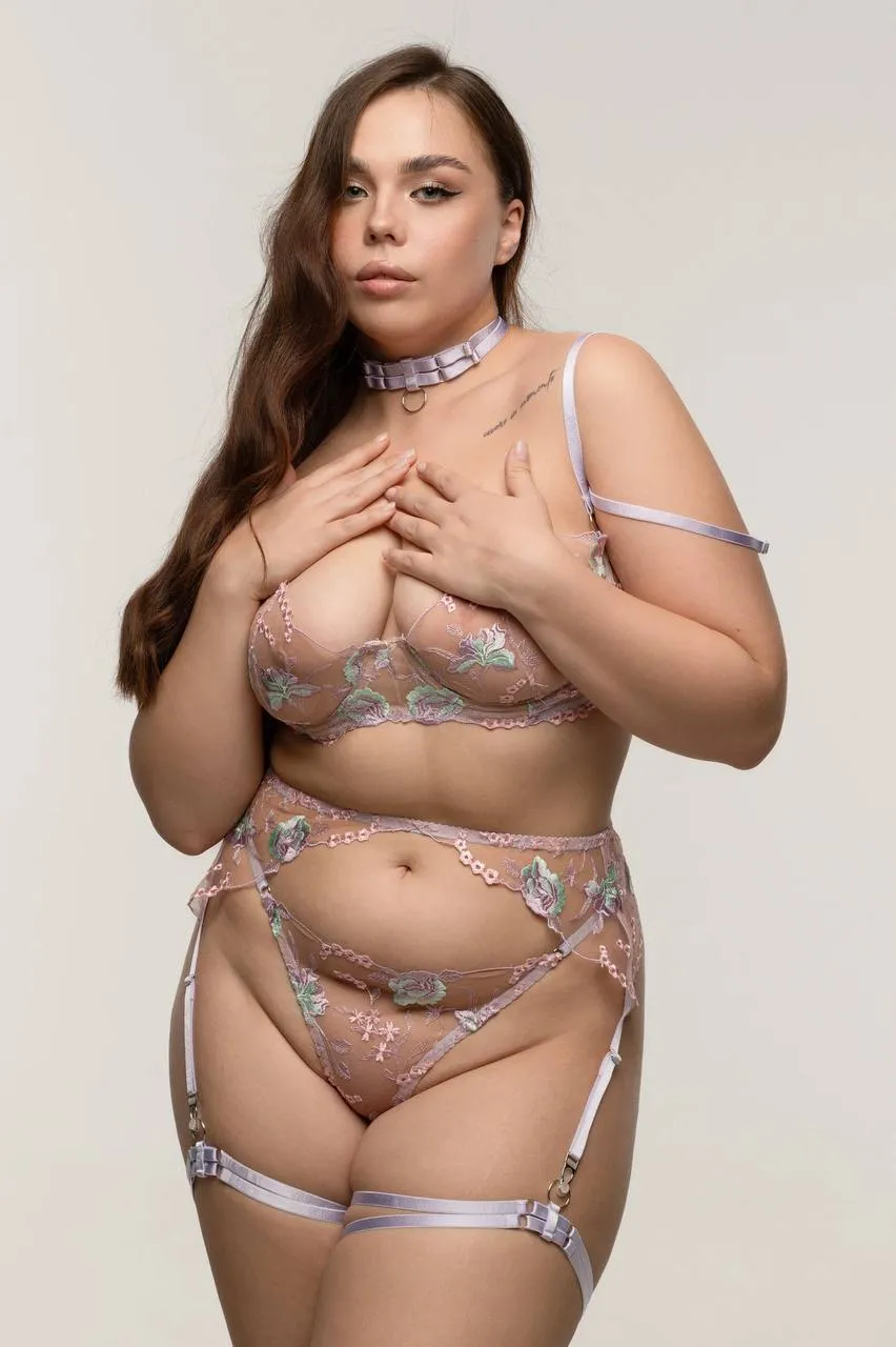 Роскошный и утонченный комплект нижнего белья Linda из сетки с вышивкой в лавандовом цвете. В комплекте: бюстгальтер, трусики, пояс с гартерами и чокер.