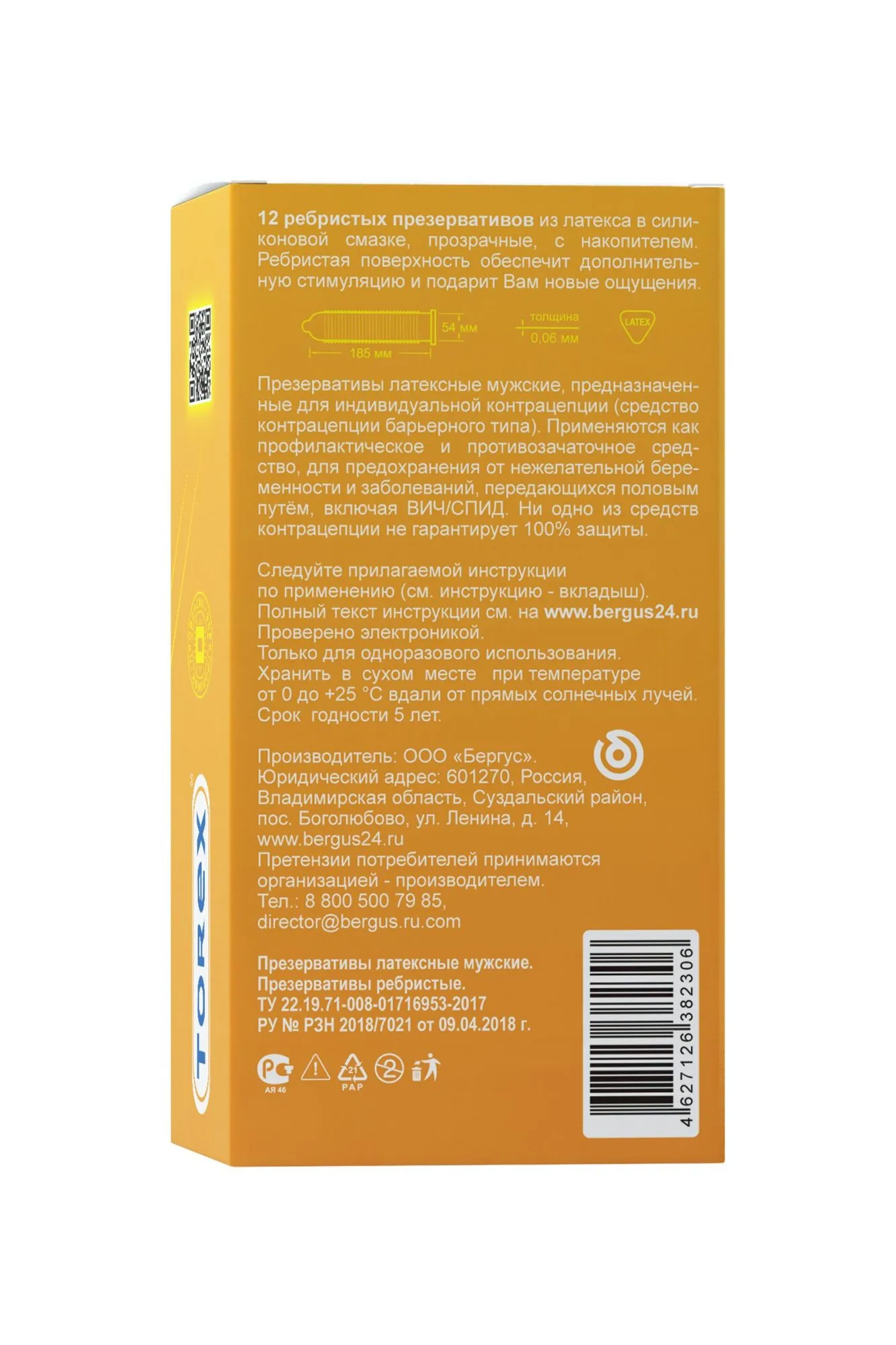 —Презервативы Torex, ребристые, латекс, 18,5 см, 5,4 см, 12 шт.