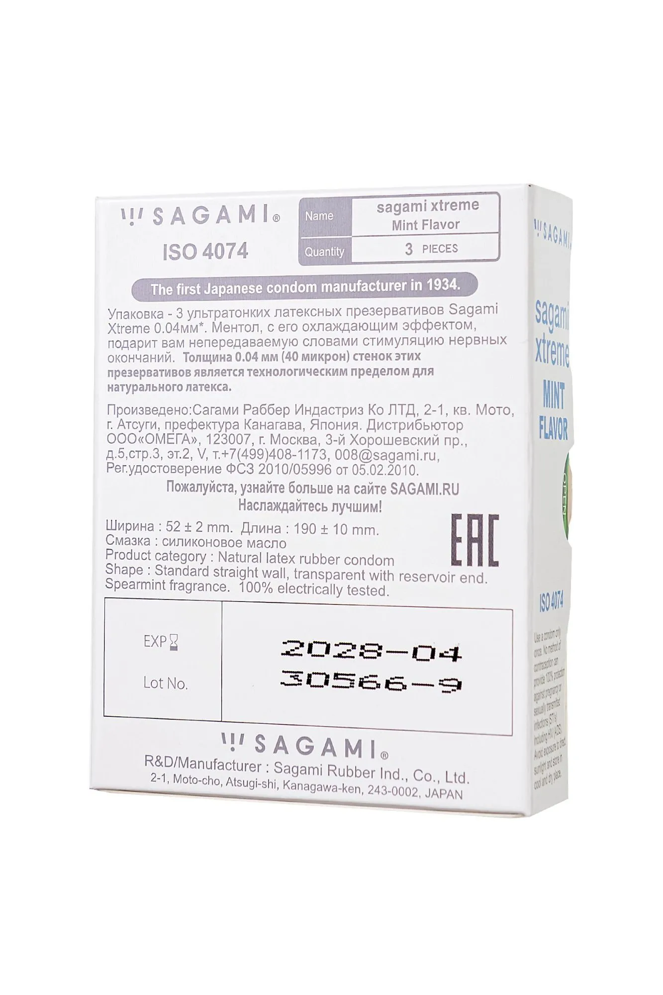 —Презервативы Sagami, xtreme, Mint, латекс, 19 см, 5,2 см, 3 шт.