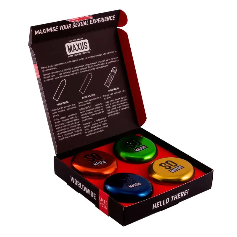 Лучший способ познакомиться с MAXUS – это Лимитированный Набор «WORLDWIDE». Весь Мир MAXUS в одной коробке! Специальный набор содержит все три вида презервативов MAXUS® в фирменных металлических кейсах, один из которых идёт В ПОДАРОК Для любой ситуации и настроения. Мы создали условия для лучшего секса. Остальное в твоих руках. Все презервативы Maxus проверены электроникой.