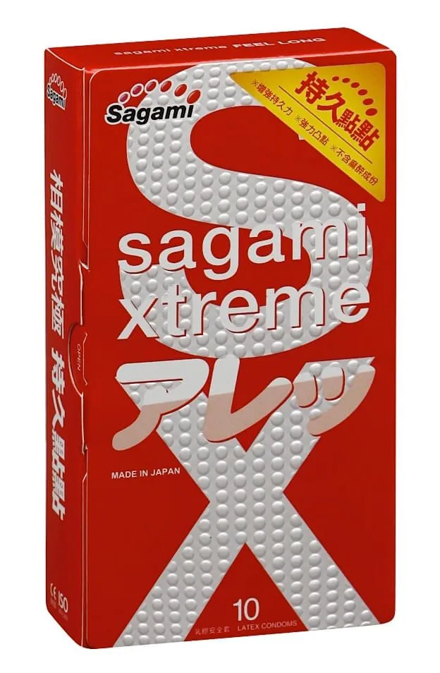 Презервативы латексные Sagami Feel Long с утолщенными стенками до 0,09 мм дают возможность увеличить время полового акта, не прибегая к использованию лубрикантов-пролонгаторов. Презерватив имеет точечную поверхность на внешней стороне, благодаря которой девушка испытает особое удовольствие. Изделие не содержит лидокаин и бензокаин.