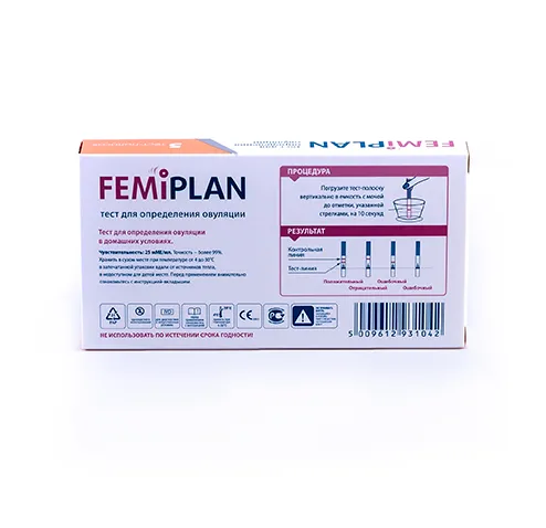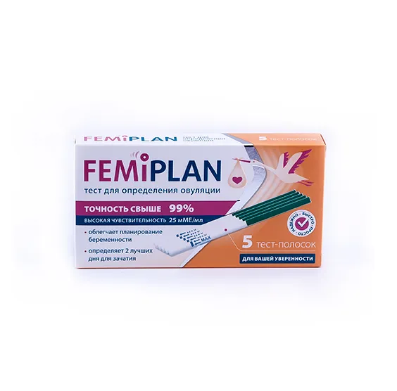 5 тест-полосок для определения двух наиболее благоприятных дней для зачатия. Femiplan поможет вам оптимально спланировать наступление беременности. Действие теста основано на определении в моче женщины концентрации лютенизирующего гормона (ЛГ) – это гормон, концентрация которого растёт по мере приближения времени наступления овуляции (момент когда яйцеклетка выходит из яичника).