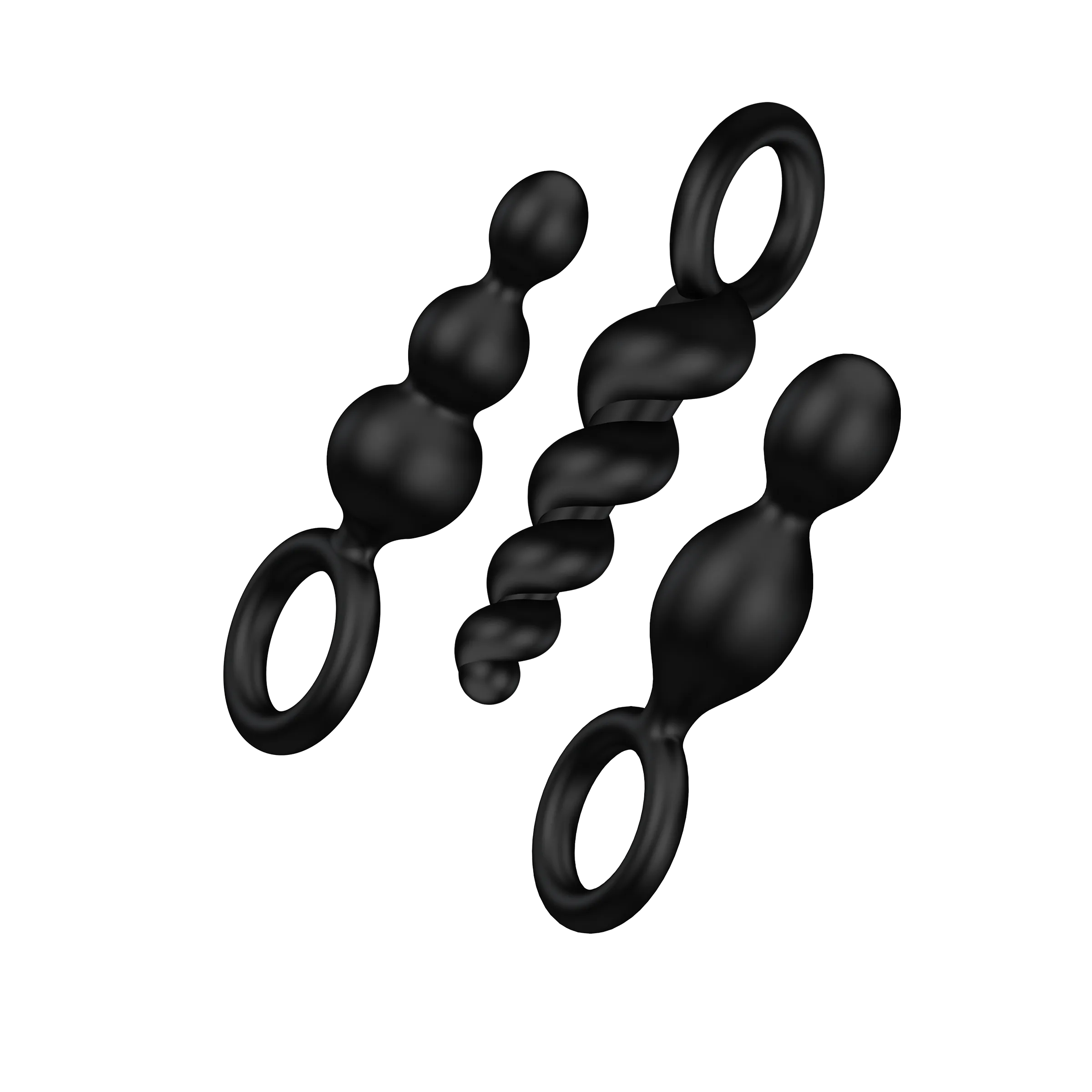 Набор из трех черных стильных анальных пробок станет Вашим идеальным компаньоном в анальных играх. Эти эластичные пробки из медицинского силикона побалуют Вас ласкающей поверхностью софт-тач и благодаря своему узкому кончику и гладкому, особо нежному качеству они подходят для новичков и первооткрывателей. Каждая пробочка имеет свою особую форму с увеличивающимся к основанию диаметром: классическая ёлочка (13,5 см), спираль (14 см) и шарики (13,5). Каждая пробка оснащена удобной ручкой-петелькой, которая сделает использование безопасным. Материал: силикон.