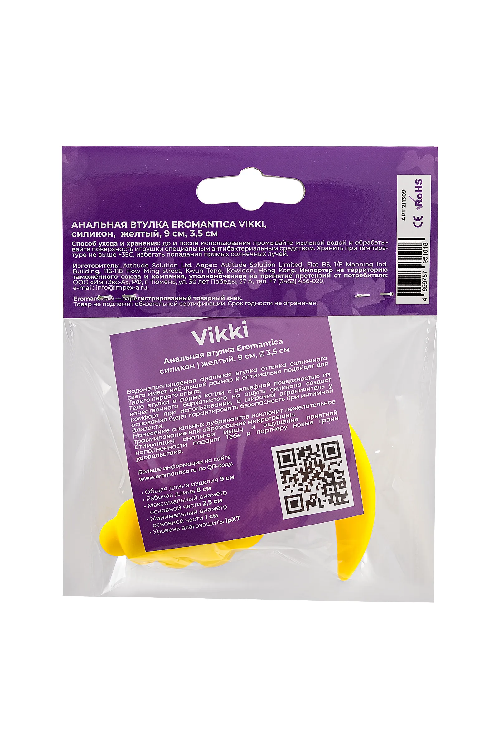 —Анальная втулка Eromantica Vikki, силикон, желтый, 9 см