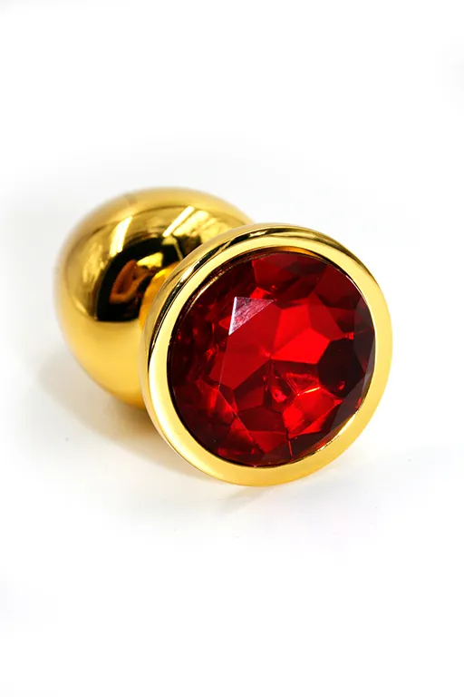 Золотая анальная пробка из аллюминия размер L. Длина - 8,4 см, диаметр - 4 см, вес - 165,5 грамма. Страз в основании круглой формы, выполнен из стекла красного цвета. Упакована в вельветовый мешочек для хранения.