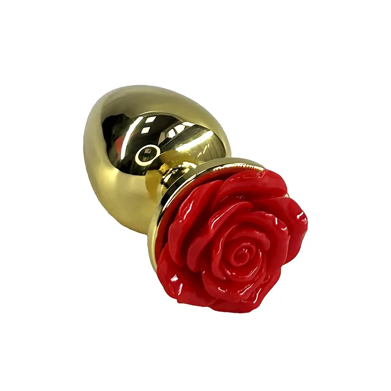 Золотая анальная пробка с ограничителем в форме красной розы, размер L