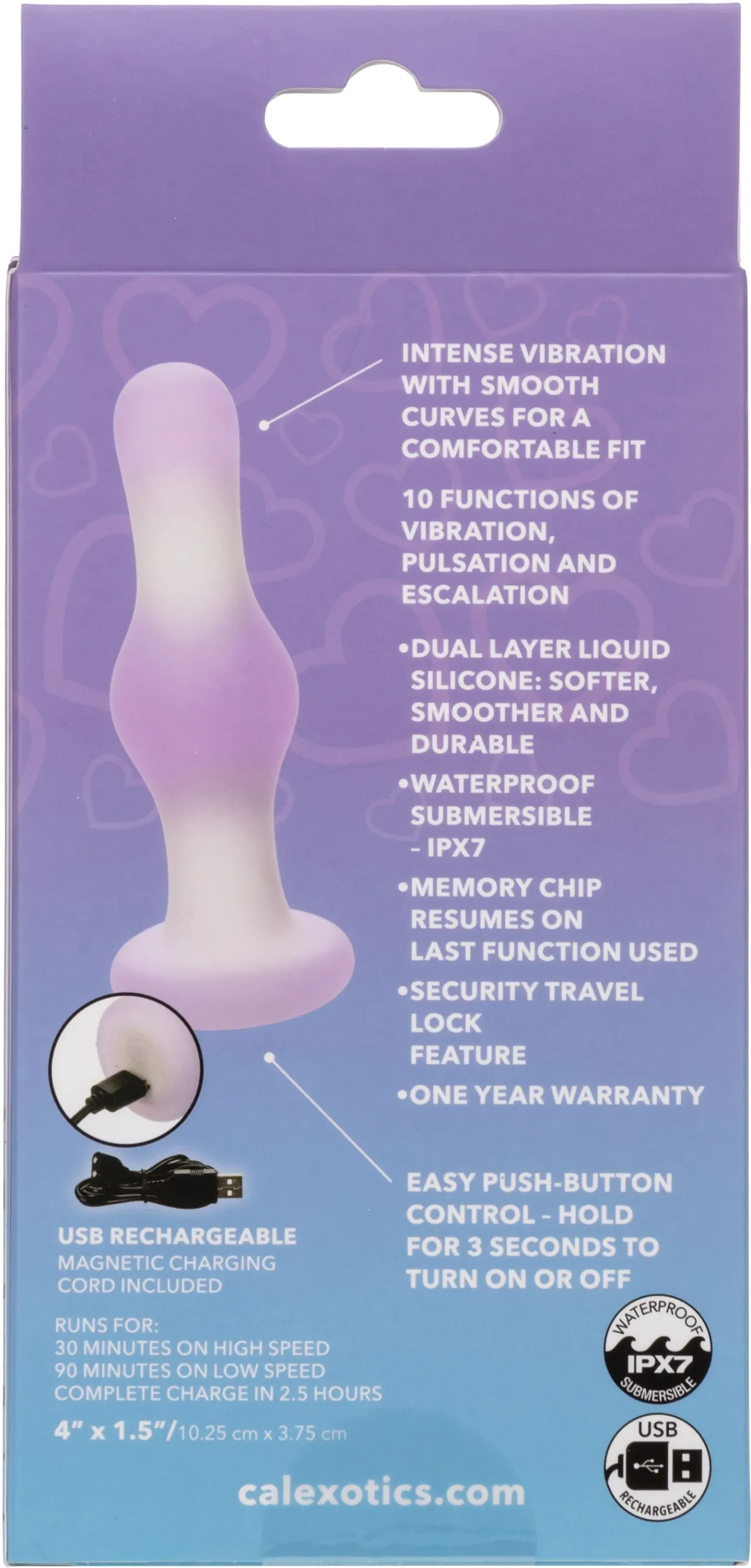 Кроме того, его современный чип памяти запоминает вашу последнюю использованную функцию, позволяя без усилий продолжить ваше приятное путешествие. Функция блокировки безопасности для путешествий гарантирует, что ваши приключения будут столь же незаметными, сколь и захватывающими. Пробка заряжается через USB. Полная зарядка занимает всего 2,5 часа, предлагая вам 30 минут высокоскоростной интенсивности или 90 минут продолжительного удовольствия на более низкой скорости.