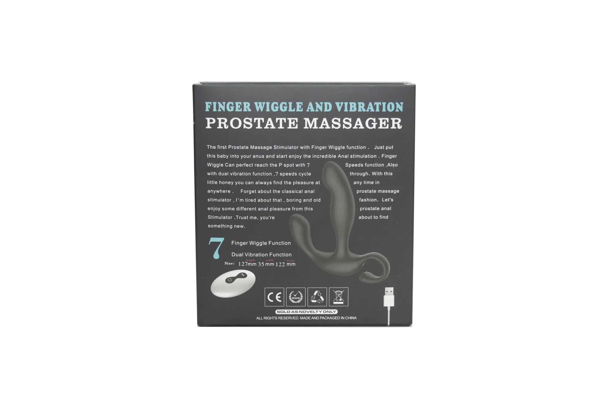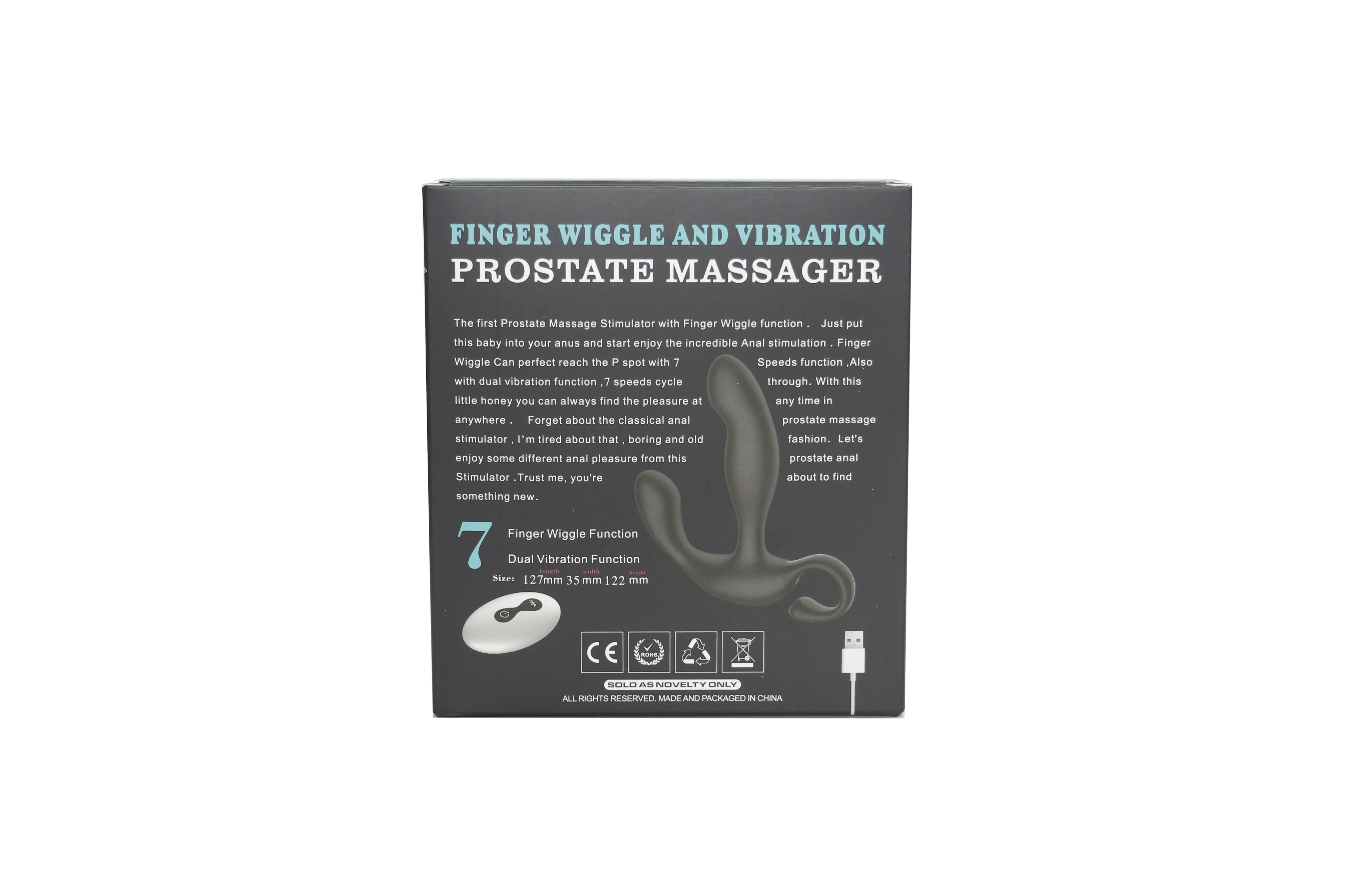 Этот массажер простаты с функцией фингеринга обладает 10 режимами скорости и 10 режимами вибрации. Изготовлен из силикона. Поддерживает управление с помощью пульта. Полностью водонепроницаемый дизайн. Время зарядки составляет 90 минут, питание от USB. Время работы - до 60 минут. Размеры: 127 мм в длину, 122 мм в ширину и 35 мм в высоту, весит 97 грамм.