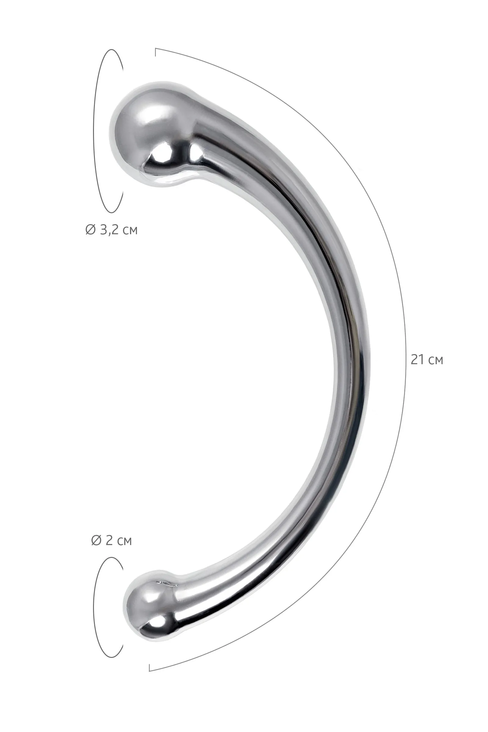 Металлический фаллоимитатор изогнутой формы с ярко выраженной головкой с обоих концов позволит испытать новые ощущения от чувственных экспериментов. Металл – один из самых безопасных и экологичных материалов, он прост в уходе, дружит со всеми видами смазок, а кроме того отлично поддается играм с температурами: для получения новых ощущений нагревайте или охлаждайте фаллоимитатор. Гладкость металла и плавность форм делают проникновение максимально комфортным. Приятная тяжесть добавит изюминку в сексуальную игру, что позволит получить еще больше наслаждения. С одной стороны диаметр головки 3,2 см – оптимальный размер для анальной или вагинальной стимуляции. Благодаря С-образной форме и внушительной головке отлично стимулирует зону G. Изогнутая форма удобно ложится в ладонь и вписывается как в сексуальную соло-игру, так и в парную