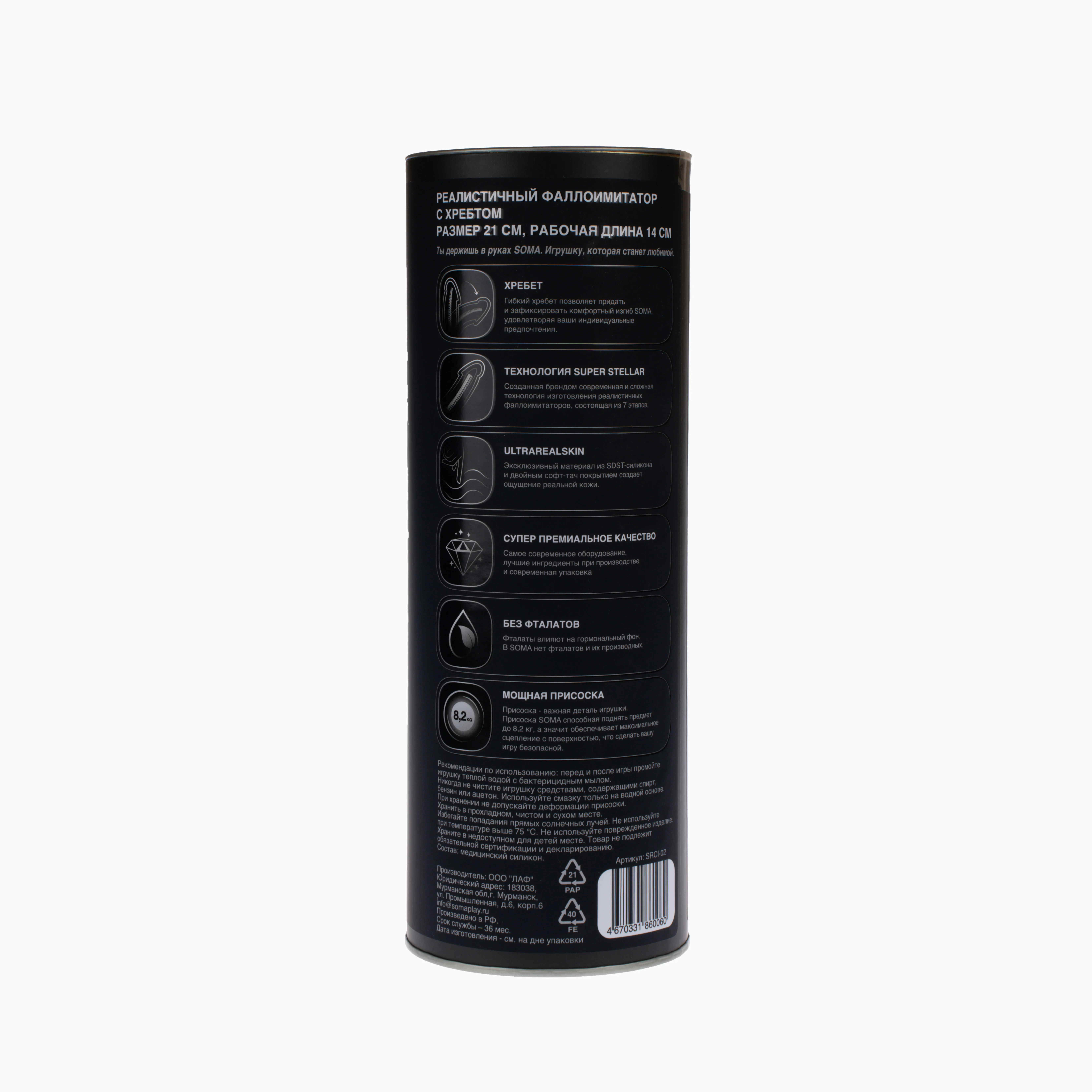 Только для тебя - товары для взрослых SOMA упакованы анонимно. Ваша покупка останется в секрете от посторонних глаз. Наши игрушки упакованы в тубы, в которых не повреждается присоска. Рекомендуем использовать с любыми лубрикантами и смазками за исключением силиконовых.