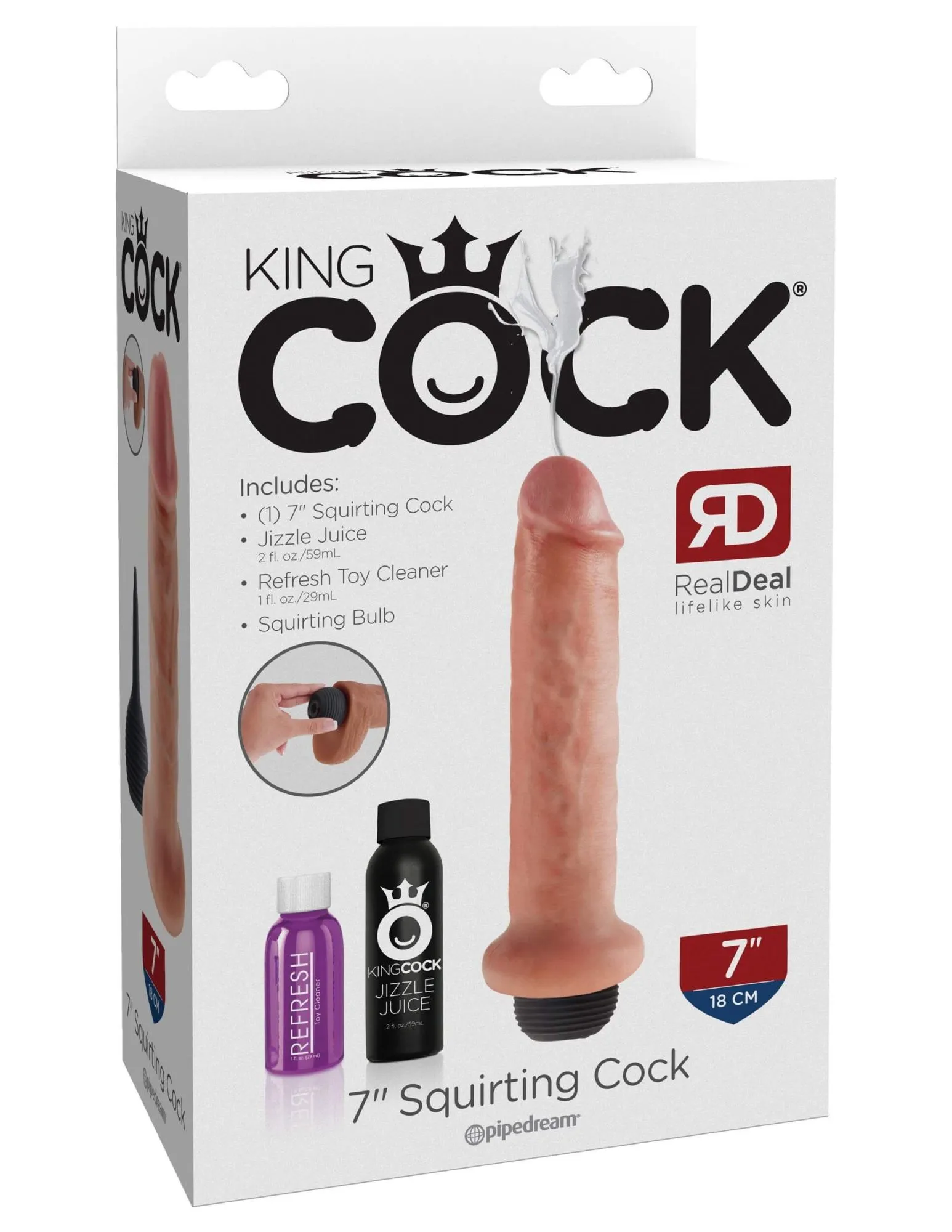 Фаллоимитатор с эякуляцией King Cock 7 inch Squirting Cock от бренда Pipedream не только выглядит очень реалистично, но и способен кончать как самый настоящий член. Для этого внутрь фаллоса вставляется небольшая силиконовая груша с жидкостью, на которую надо нажать в кульминационный момент!