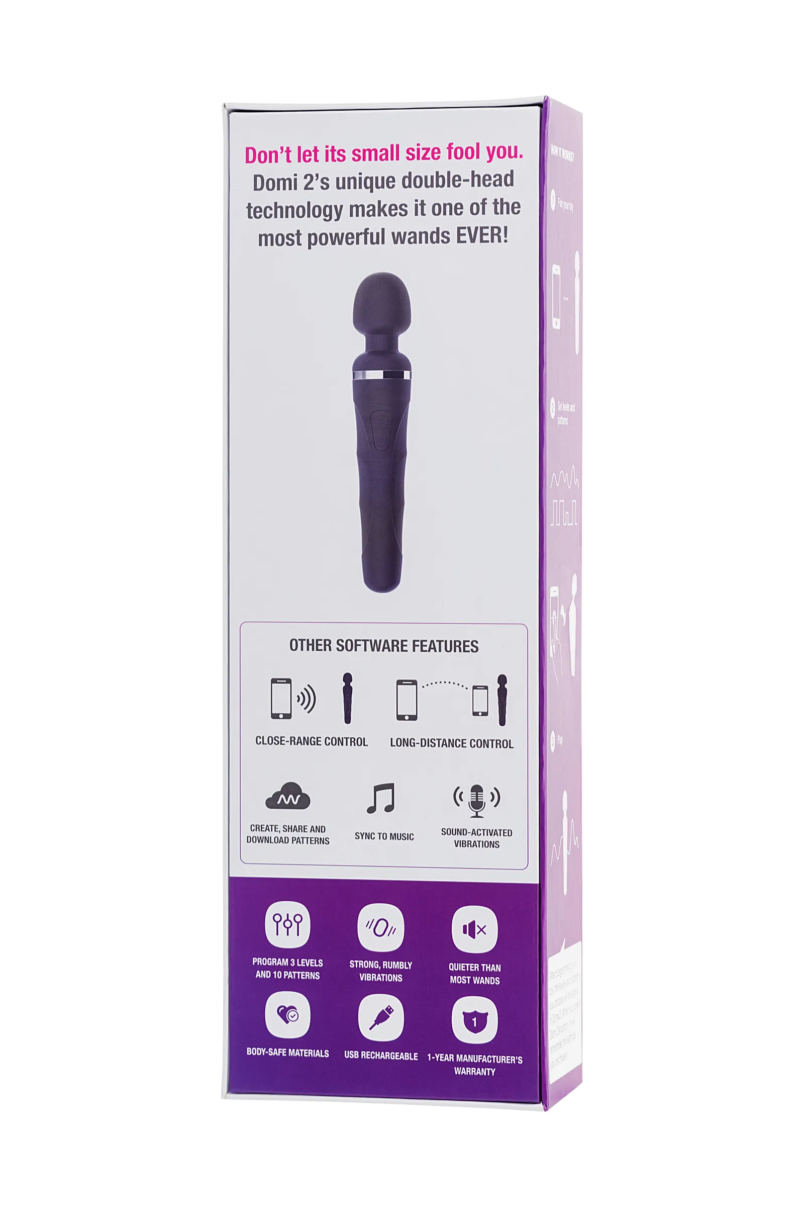 Познакомьтесь с Domi 2 от Lovense – это мини ванд-массажер, ставший настоящей сенсацией. Управляйте им через приложение с помощью Bluetooth и наслаждайтесь мощными и сильными вибрациями. Этот ванд-массажер идеально сочетает в себе мощность, функциональность и безопасность. С широким спектром паттернов интенсивности и вибрации помимо предустановленных 10 паттернов вибраций и 3-х уровней интенсивности, Domi 2 позволяет настроить уровень мощности, который соответствует вам наилучшим образом. Используйте его для достижения множества интенсивных оргазмов и управляйте им на расстоянии благодаря функциям приложения Lovense Remote и подключению с антенной новейшей технологии и чипом Bluetooth. Вы можете настроить вибрацию на нужный вам уровень - от "легкого" до "землетрясения" - и программировать его на кнопки игрушки. А можете управлять им на любом расстоянии, наблюдая за удовольствием на лице вашего партнера даже во время видеозвонка. С Domi 2 вы легко контролировать давление и наслаждение, используя опциональное световое кольцо на игрушке, чтобы уведомить своего партнера на расстоянии. Вы также можете синхронизировать вибрации с музыкой на вашем телефоне и наслаждаться непредсказуемыми ощущениями. Domi 2 обладает уникальной технологией двойного вращения головки, которая обеспечивает интенсивные и впечатляющие вибрации. Усиленная шейка гарантирует комфорт и позволяет применять игрушку точно по вашим предпочтениям. Этот массажер идеален для прелюдии и стимуляции клитора или любых других внешних частей. Несмотря на свой компактный размер, этот ванд-массажер демонстрирует высокую производительность, превосходящую многие другие модели. Мини ванд-массажер Domi 2 имеет продуманный дизайн с удобным и надежным захватом, обеспечивающим безупречную функциональность. Элегантный черный цвет и шелковистый высококачественный силикон приятно дополняют богатый функционал этой палочки-выручалочки. Domi 2 весит 300 гр, приятно лежит в руке, но не отягощает своим весом. Батарея Domi 2 является долговечной и способна обеспечить до 6 часов непрерывной работы. Водонепроницаемость IPX6 позволяет использовать его даже в условиях сильных брызг воды. Используйте дополнительные мужские и женские насадки (не входят в комплект), чтобы попробовать функционал Domi 2 на полную мощность! Что в комплекте: Ванд Domi 2 c Bluetooth USB Кабель для подзарядки Руководство пользователя Сумка для хранения