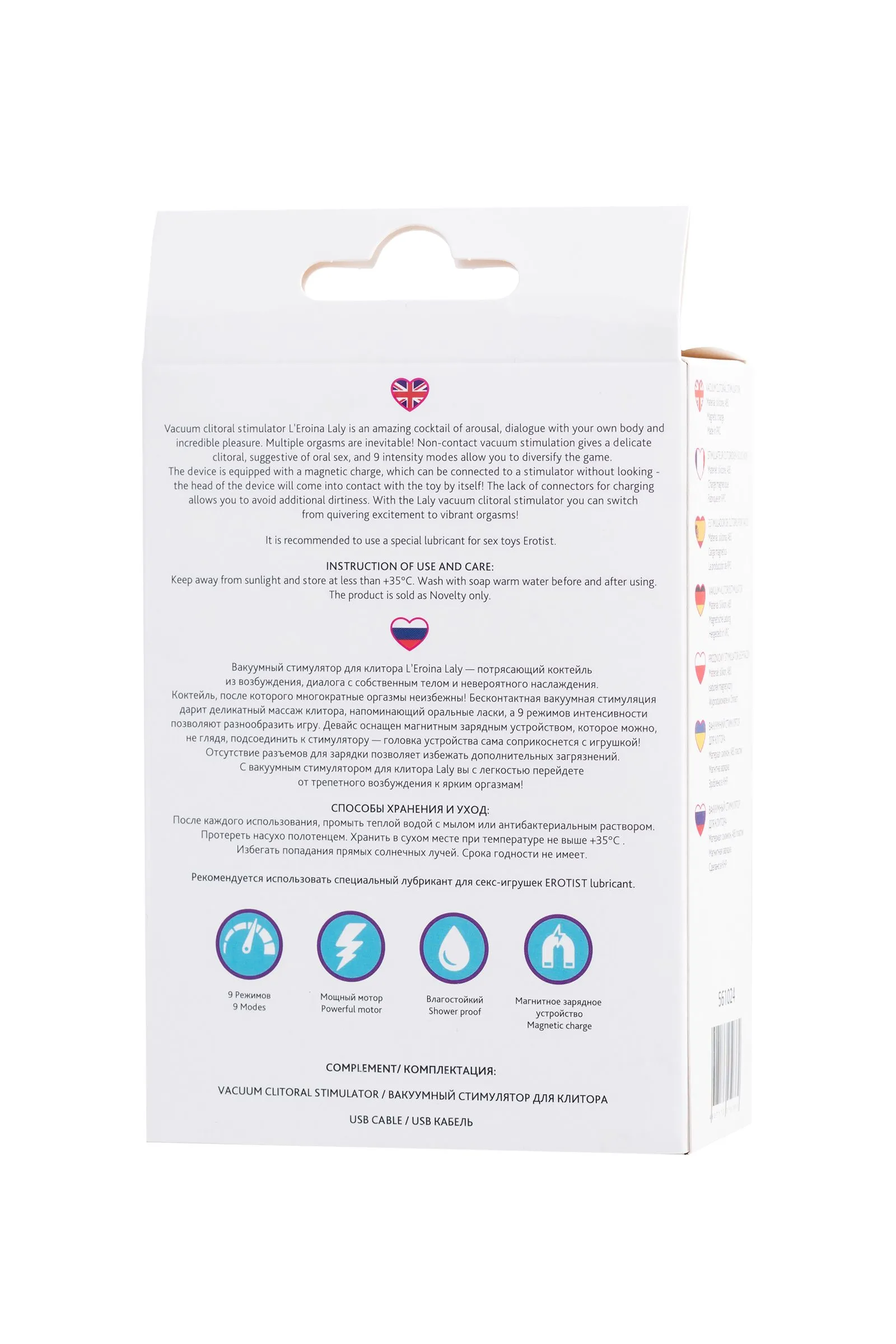 Вакуумный стимулятор для клитора L’Eroina Laly — потрясающий коктейль из возбуждения, диалога с собственным телом и невероятного наслаждения. Коктейль, после которого многократные оргазмы неизбежны! Бесконтактная вакуумная стимуляция дарит деликатный массаж клитора, напоминающий оральные ласки, а 10 режимов интенсивности позволяют разнообразить игру. Девайс оснащен магнитным зарядным устройством, которое можно, не глядя, подсоединить к стимулятору — головка устройства сама соприкоснется с игрушкой! Отсутствие разъемов для зарядки позволяет избежать дополнительных загрязнений. С вакуумным стимулятором для клитора Laly вы с легкостью перейдете от трепетного возбуждения к ярким оргазмам! Длина: 10 см Уровень шума ≤50 dB Время зарядки 2 ч Время использования 1,5 ч