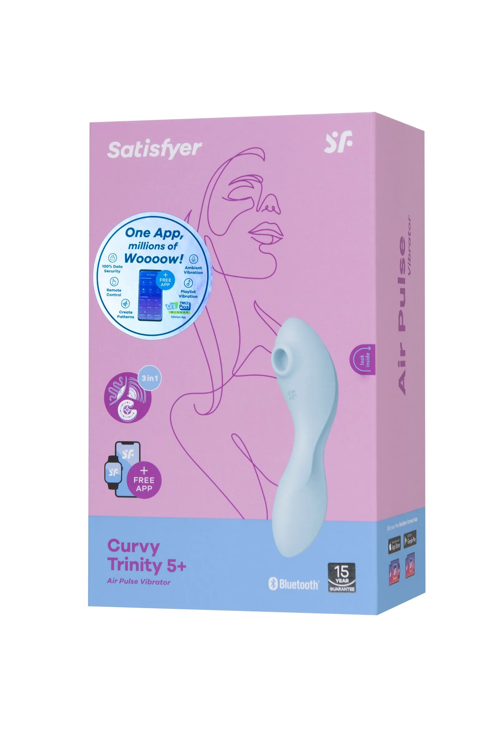 Инновационный вибратор 3 в 1 Curvy Trinity 5+ от Satisfyer создан дарить максимальное удовольствие. Этот вибрирующий и пульсирующий любовник с тройным эффектом станет вашим любимым приобретением. Многофункциональный красавчик сочетает в себе наружную стимуляцию клитора воздушными волнами и вибрацией, внешнюю стимуляцию эрогенных зон и внутреннее воздействие на зону G проникающими виброволнами. С одной стороны стимулятора имеется раструб, который балует вашу жемчужинку воздушной пульсацией, превосходящей любые оральные ласки. Бесконтактная стимуляция клитора – новейшая запатентованная технология Air Pulse для женских оргазмов будет сводить вас с ума снова и снова. А в сочетании с проникающей вибрацией Curvy Trinity 5+ дарит клитору умопомрачительные ощущения, меняющие представление об оргазмах. С другой стороны гладкий сужающийся ствол, идеально подходящий для прицельного массажа точки G. Длина погружной части 8 см, диаметр 3,7 см. Благодаря изогнутой форме Curvy Trinity 5+ также можно использовать в качестве вибратора для наружных эрогенных зон. Дополнительный ребристый рельеф сделает проникновение более пикантным. Curvy Trinity 5+ обладает двумя автономными моторами. Комбинируйте воздушную пульсацию и проникающие волны вибрации, чтобы достигать неземного блаженства каждый раз. В вашем распоряжении 11 уровней интенсивности вакуум-волновой стимуляции и 12 программ вибрации – от нежной до интенсивной. Интуитивно понятное управление с помощью трех кнопок на корпусе. Испытайте удовольствие по-настоящему с бесплатной функцией управление при помощи смартфона с поддержкой Bluetooth через приложение Satisfyer Connect, доступное на Android и iOS. Создавайте собственные уникальные режимы вибрации, существенно расширив возможности предустановленных режимов. Девайс способен вибрировать даже в такт музыке. Satisfyer Connect не имеет границ – передавайте управление удовольствием партнеру даже на большом расстоянии. Благодаря нежному материалу, из которого выполнен Curvy Trinity 5+, вам будет комфортно и приятно держать его в руках и получать удовольствие от его вибрации и пульсации. Высококачественный шелковистый на ощупь гипоаллергенный силикон – визитная карточка бренда Satisfyer. Поверхность раструба мягко и деликатно стимулирует клиторальную область, тактильно нежный и приятный на ощупь, силикон быстро адаптируется к температуре вашего тела. Чтобы получить максимум удовольствия и сохранить материал в наилучшем виде, рекомендуется пользоваться качественной смазкой на водной основе. После использования обязательно очищайте игрушку теплой водой со специальными бактерицидными спреями для интимных товаров. Особенности: Возможность одновременного воздействия на клитор воздушной пульсацией и вибрацией. Изогнутая форма и мощные проникающие вибрации для зоны G. Простое управление отдельными моторами двумя кнопками. 12 режимов вибрации и 11 режимов волновой стимуляции. Неограниченные возможности управления через приложение Satisfyer Connect. Нежный голубой цвет и мягкий, эластичный силикон без запаха, без аллергенов и вредных для здоровья веществ. 100% водонепроницаемый - IPX7. Время работы 60 минут. Перезаряжаемый, магнитный USB-кабель, время зарядки 2,5 часа.