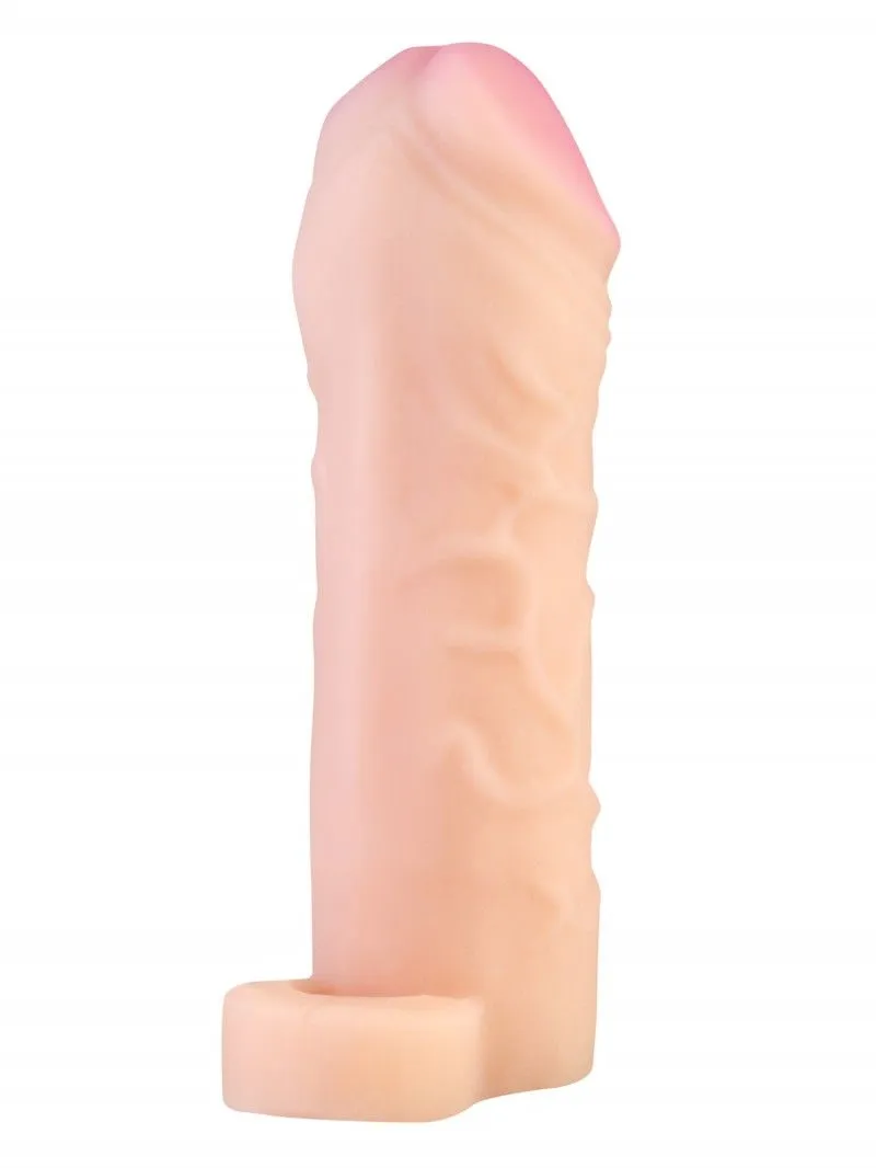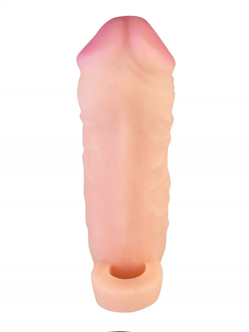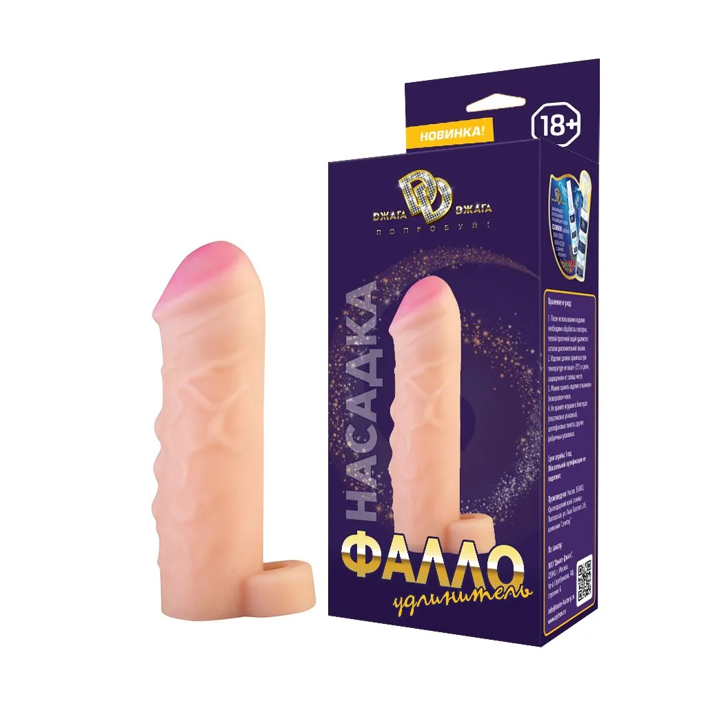 Насадка-удлинитель на пенис обеспечивает увеличение размера как в длину, так и в толщину. Сделана из полимера, создающего имитацию мягкой, шелковистой "кожи" с ощущением реального фаллоса при интимном контакте. Насадка увеличивает время близости и компенсирует анатомическое несоответствие партнеров. Тело насадки ровное, гладкое, с небольшой головкой. Благодаря высокой эластичности материала насадка плотно обхватывает и надежно прилегает к члену, как вторая кожа. Для дополнительной фиксации имеется петля для крепления под мошонкой. Размер и объем петли позволяет удерживать насадку и обеспечивает чувственную стимуляцию, сделав акт продолжительнее. Тело насадки с выраженным рельефом из вен и выступающих узелков. Головка ярко выраженная, массивная.