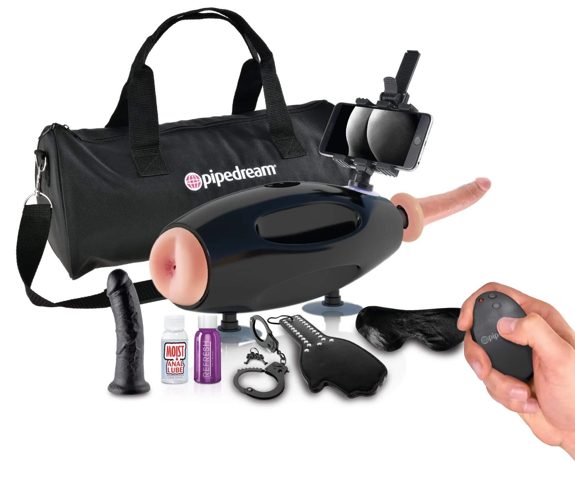 В комплект входят: секс-машина, мастурбатор, 2 фаллоимитатора (17.8 и 20.3 см), беспроводной пульт управления, держатель для мобильных устройств, универсальный сетевой адаптер, наручники, сумка для путешествий, шлепалка, кожаная маска, очиститель для игрушек и лубрикант.