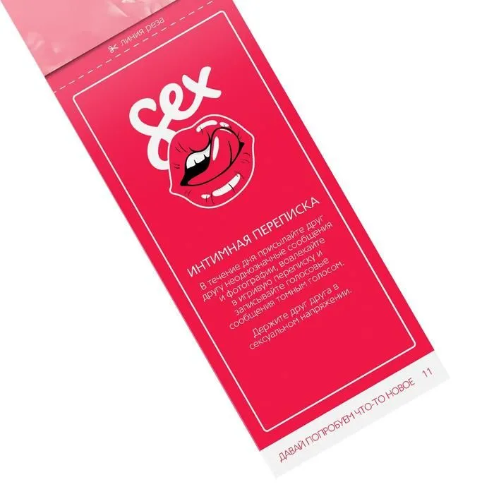 Как разнообразить сексуальную жизнь и добавить в неё ещё больше ярких эмоций? В этом наборе вас ждёт 12 способов вернуть в отношения страсть, азарт и испытать новые ощущения. Как использовать купоны? Просто разрезайте купоны по пунктирной линии, выбирайте то, чем хотите заняться сегодня, и воплощайте написанное в жизнь! Дарите друг другу любовь и наслаждение!