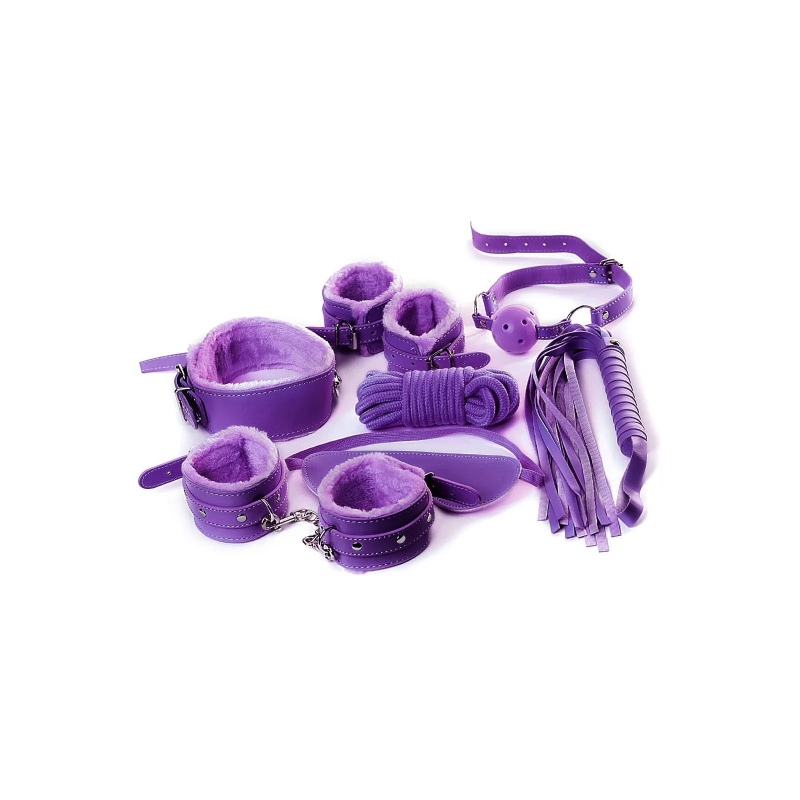 В комплекте: наручники, оковы, ошейник с поводком, кляп-шарик, плеть, веревка для связывания, маска на глаза, набор карт, контракт.