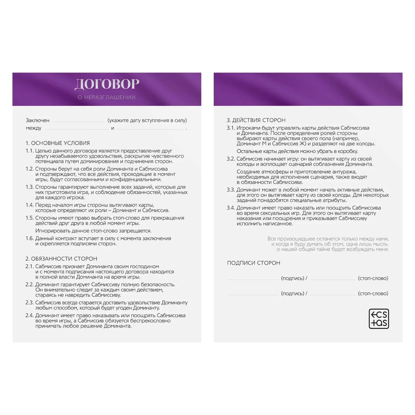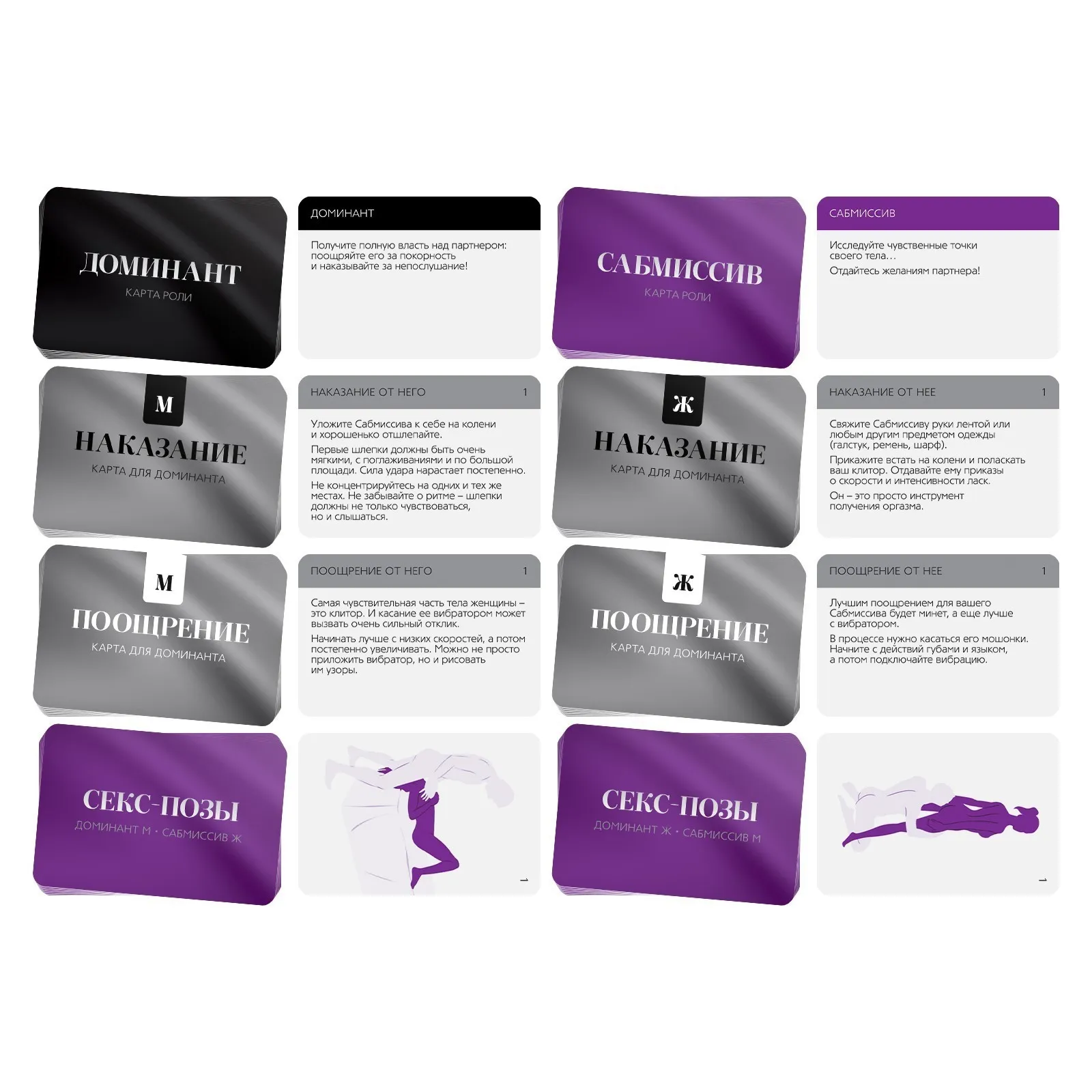 Подпишите договор о неразглашении и выберите желаемую роль. Один из вас будет доминирующим (доминантом), а другой — подчиняющимся (сабмиссивом). В комплекте есть карты действия для обоих партнёров. На них вас ждут возбуждающие задания с элементами БДСМ. По очереди вытягивайте карточки, предназначенные для вашей роли, и выполняйте задания. В комплекте также есть карты поз и аксессуары, они добавят перчинки в игру. Окунитесь в мир эротических фантазий!